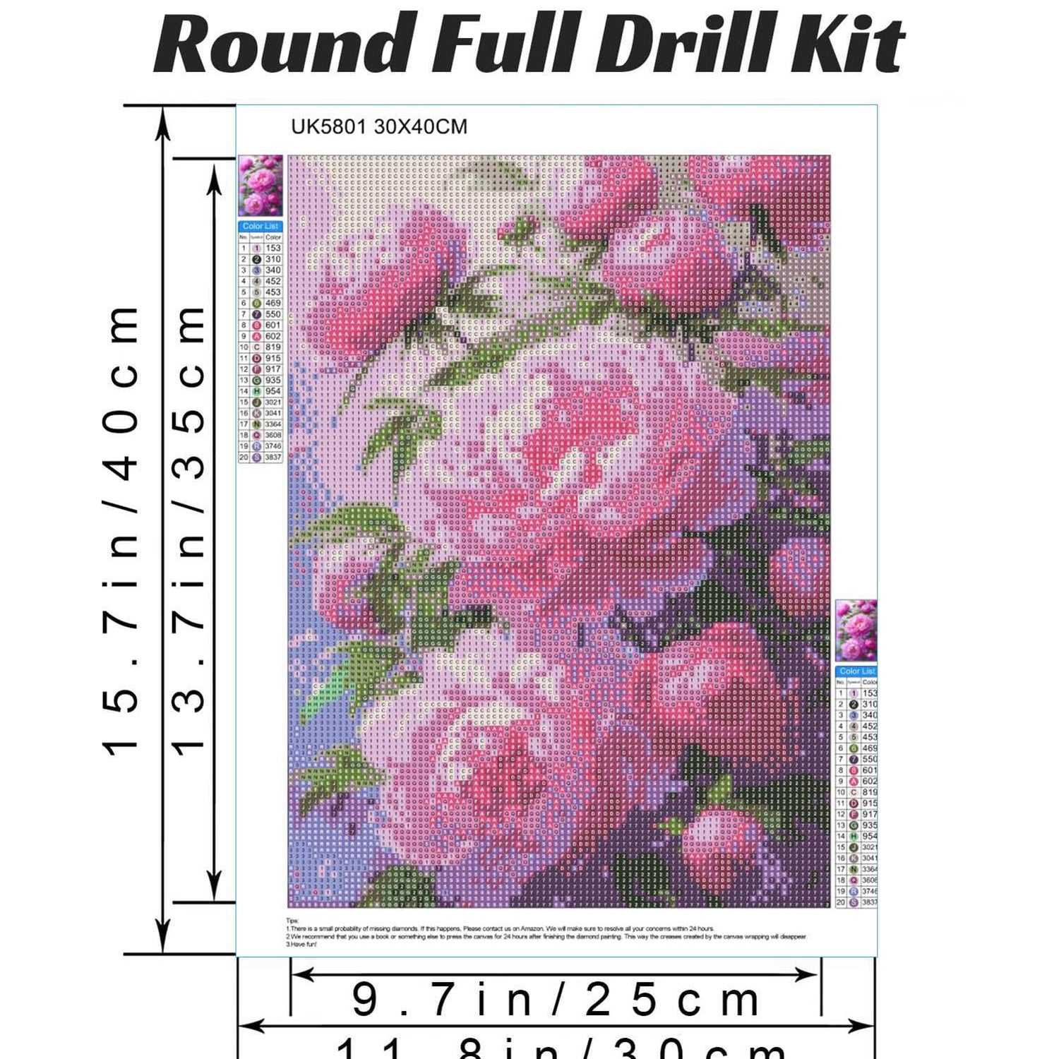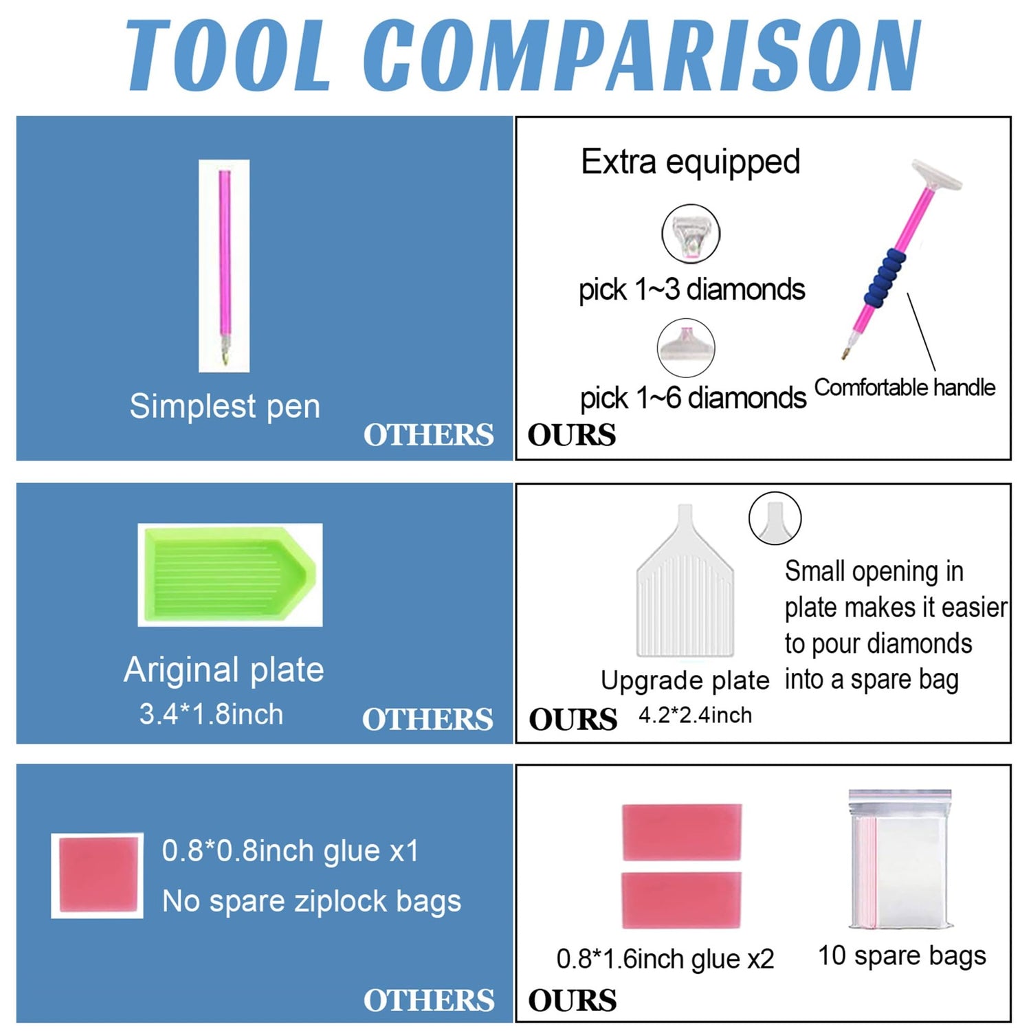 - 【Diamond Art Kits】Include 1*HD print canvas,1*pen,1* 3-drill pen tip,1* 6-drill pen tip,4*glue, 1*plate,5*spare ziplock bags and sufficient number of round diamonds.