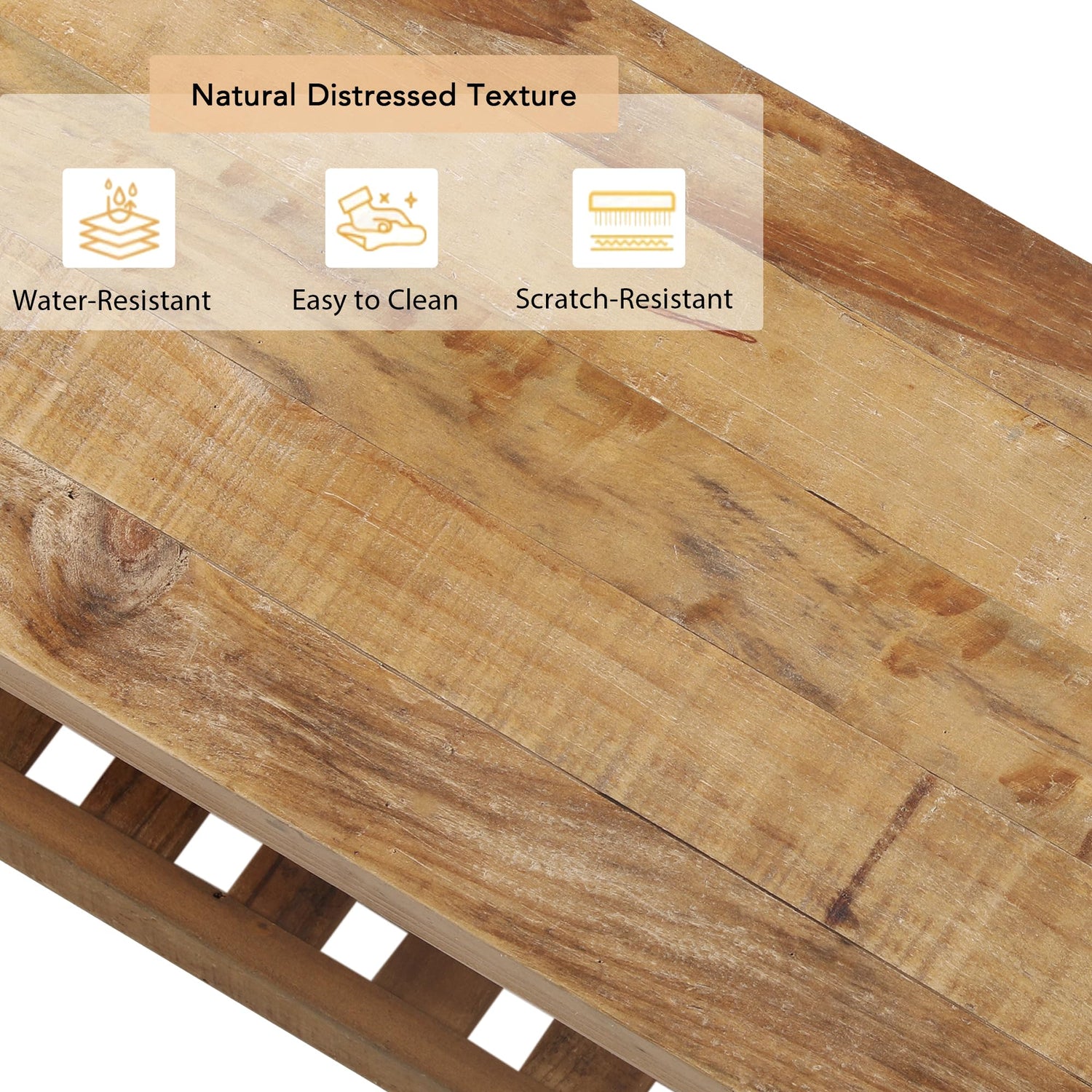 - Smart Storage, Sleek Design-Featuring a 2-tier layout, this long bench combines functionality with rustic charm. The lower shelf provides convenient storage for shoes, blankets, or decor, while the sturdy, space-efficient design ensures it fits seamlessly into any room. Equipped with protective felt pads, it prevents floor scratches and adds stability. Perfect for entryways, living rooms, or small spaces, this mudroom bench offers both practicality and timeless style.