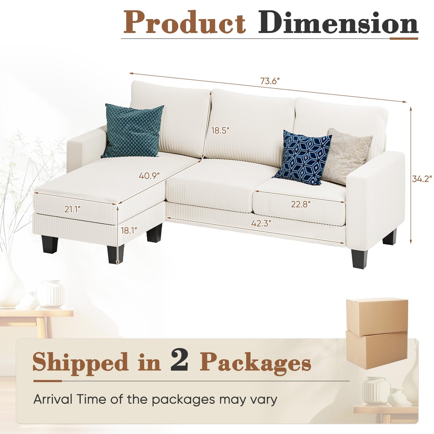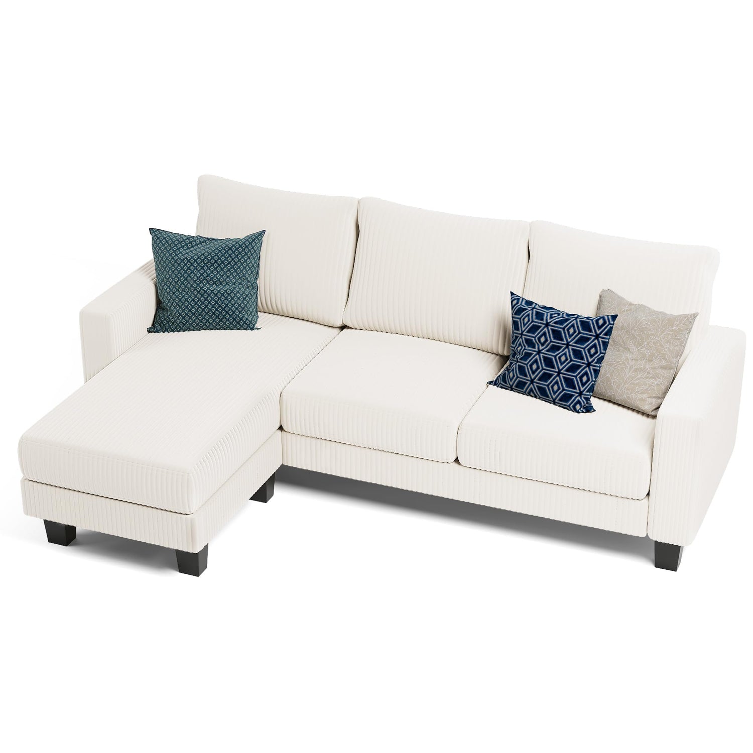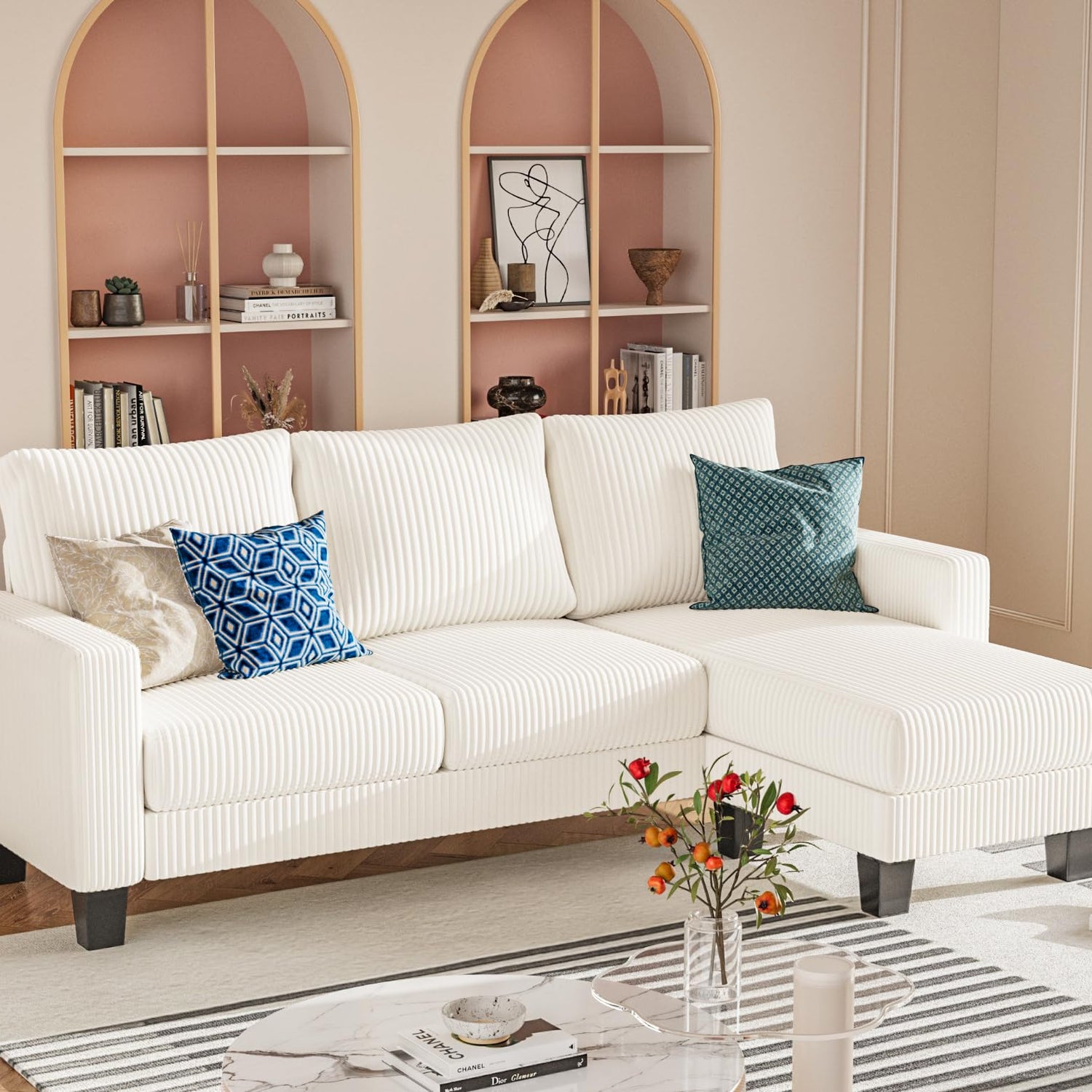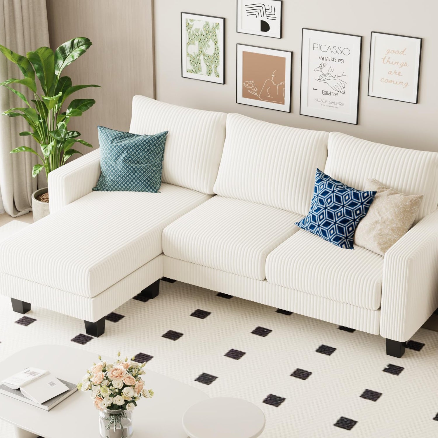 Homall Sofa for Living Room, Couch with Convertible Chaise, 3 Seat L-Shaped Sofas, Comfy Corduroy Couches for Apartment, Small Space, Cream