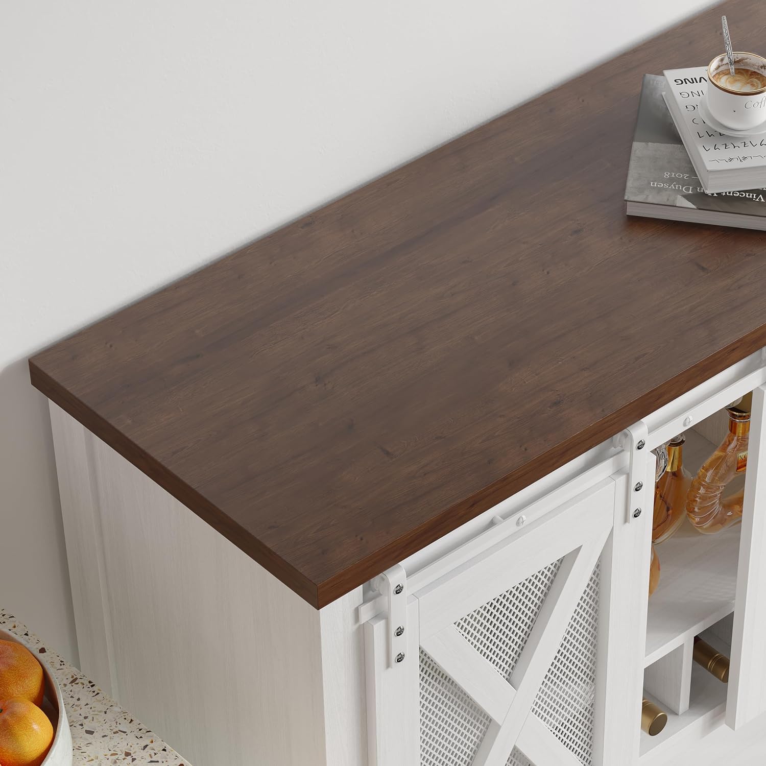- √ Sliding Barn Doors for Easy Access: Enjoy convenient access to this bar table with smooth and quiet sliding metal doors. The unique barn metal mesh design allows for customizable storage and display options, making organization a breeze. This coffee bar cabinet is the perfect solution for keeping your belongings neatly stored and easily reachable.