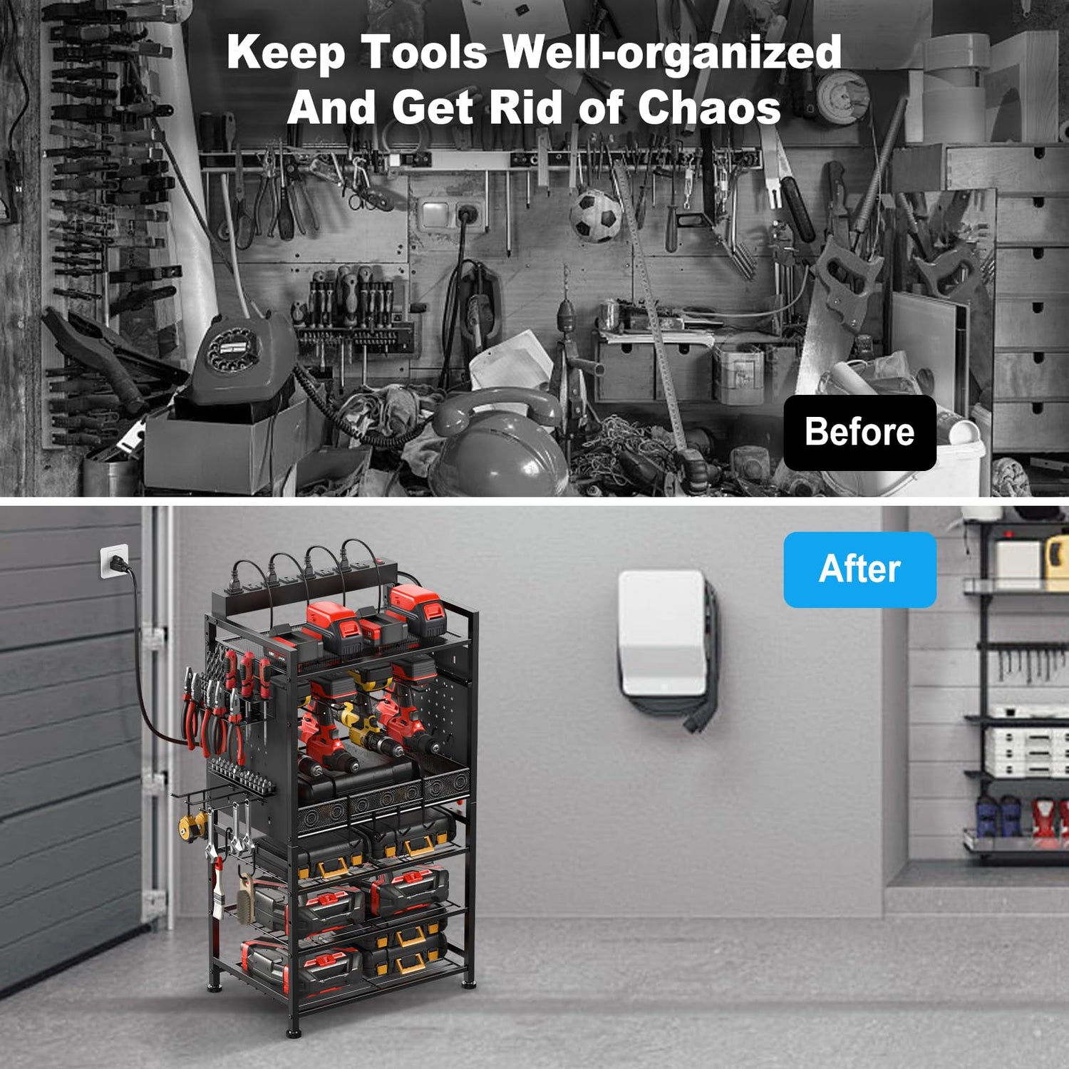 - All In One Power Tool Organizer: Our power tool organizer with 8 outlets power strip adopts 6 layer floor stand design, including 4 shelves, 1 storage basket layer, and 1 drills holder layer which can store up to 8 drills or be used as hooks. Sides panel pegboard design with bits organizer and screwdriver rack. Equipped with extra four types of hooks. Accommodate various workshop tools such as batteries, toolboxes, screwdrivers, screwdriver bits, pliers, tape measures, etc