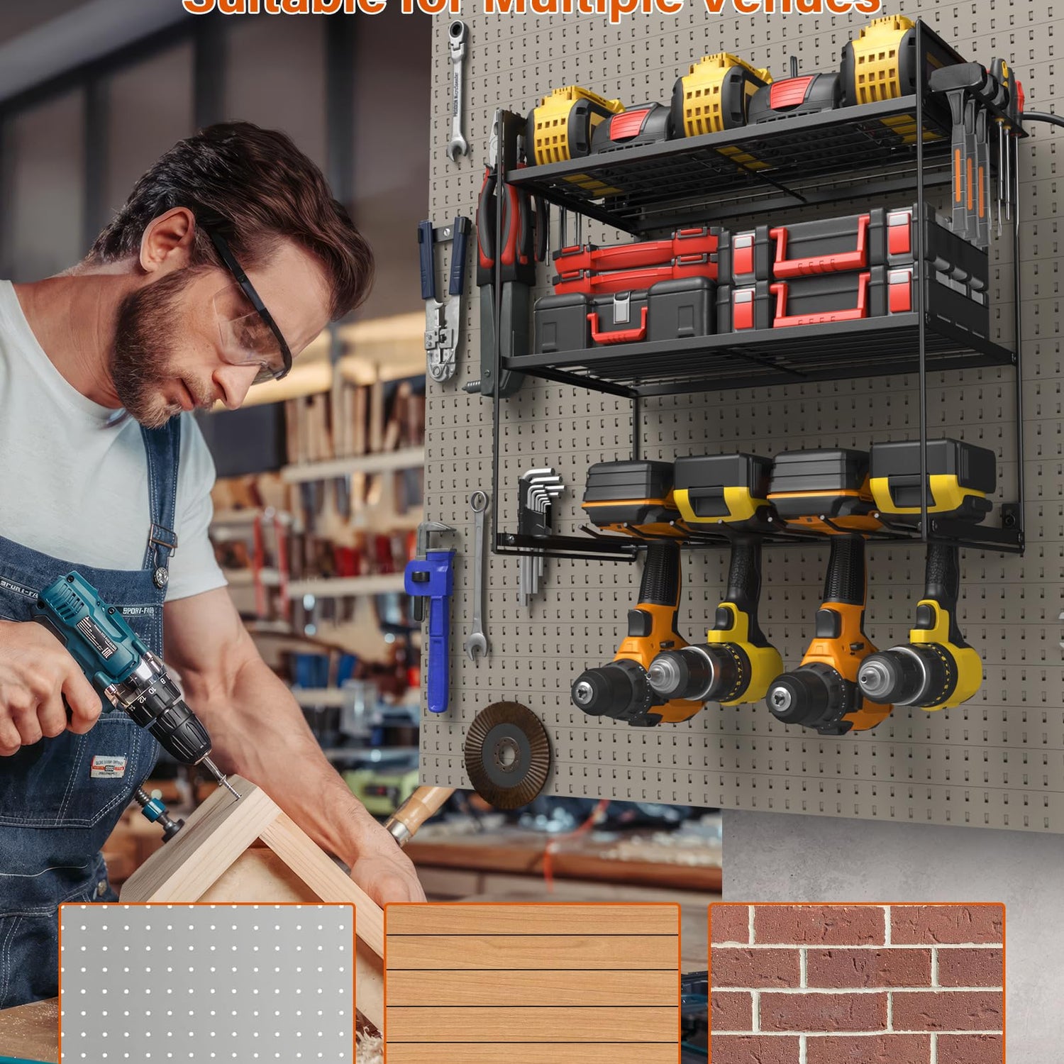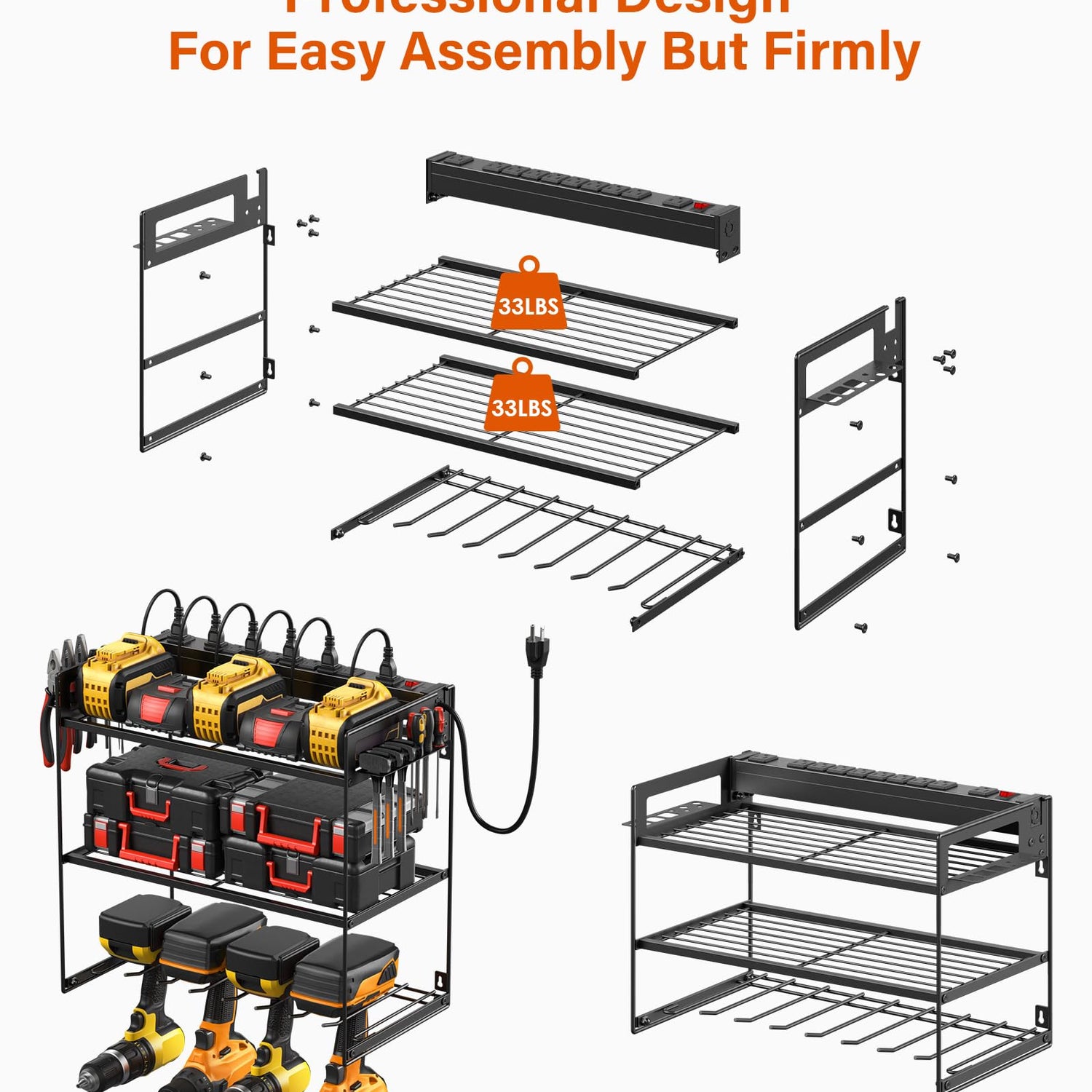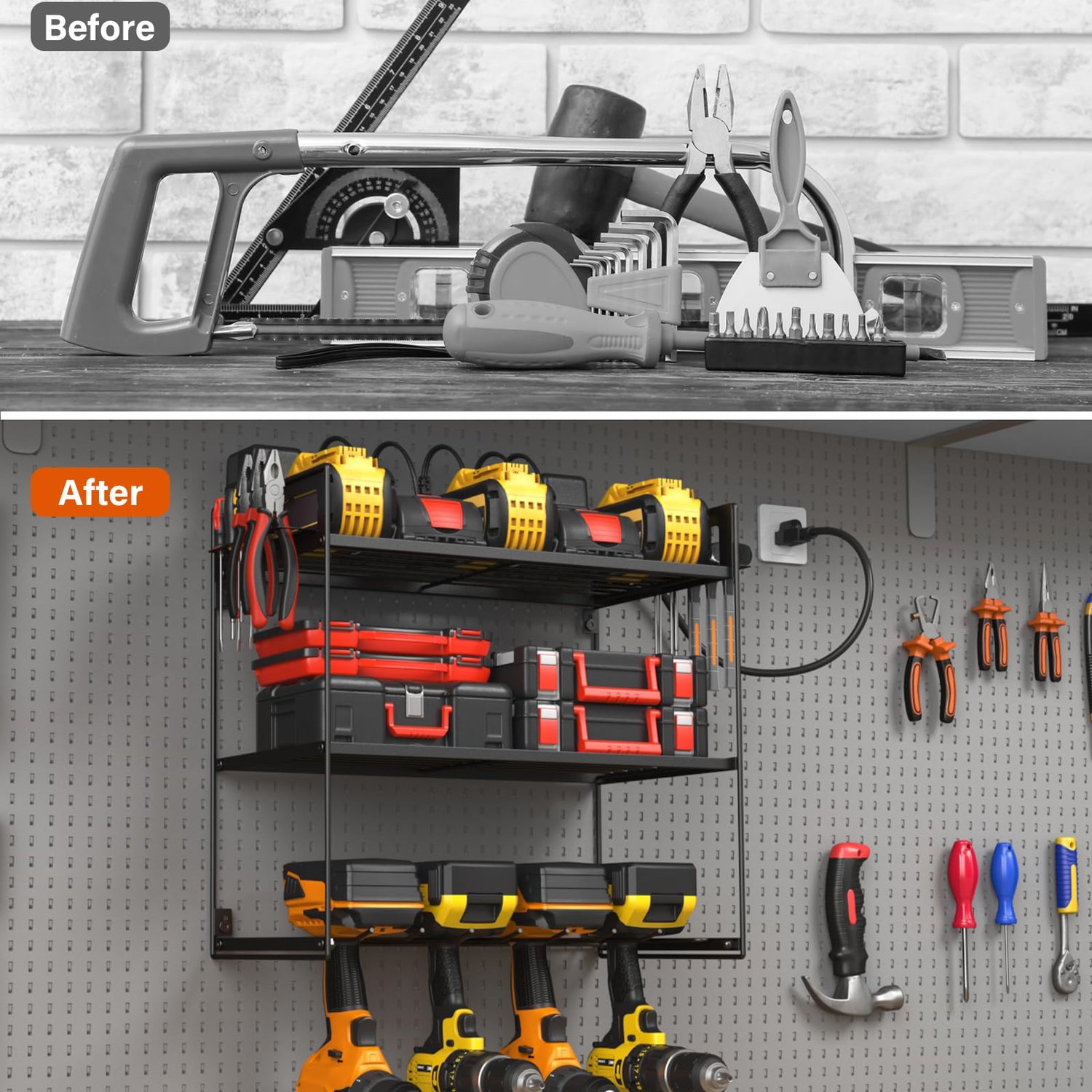 - Power tool organizer with charging in one, it is dedicated to providing an organized and efficient workspace for you. Tool organizer with 10 outlet power strip, three-tier design allow to store 4 drills on the bottom tier, batteries, chargers and other tools on the top two tiers and a hammer holder, pliers holder are added to the side.