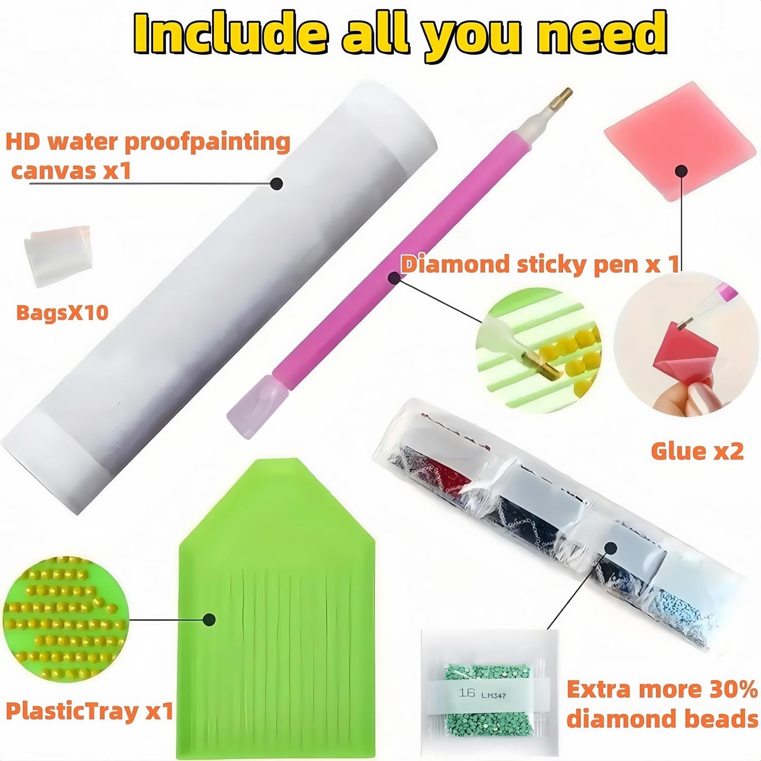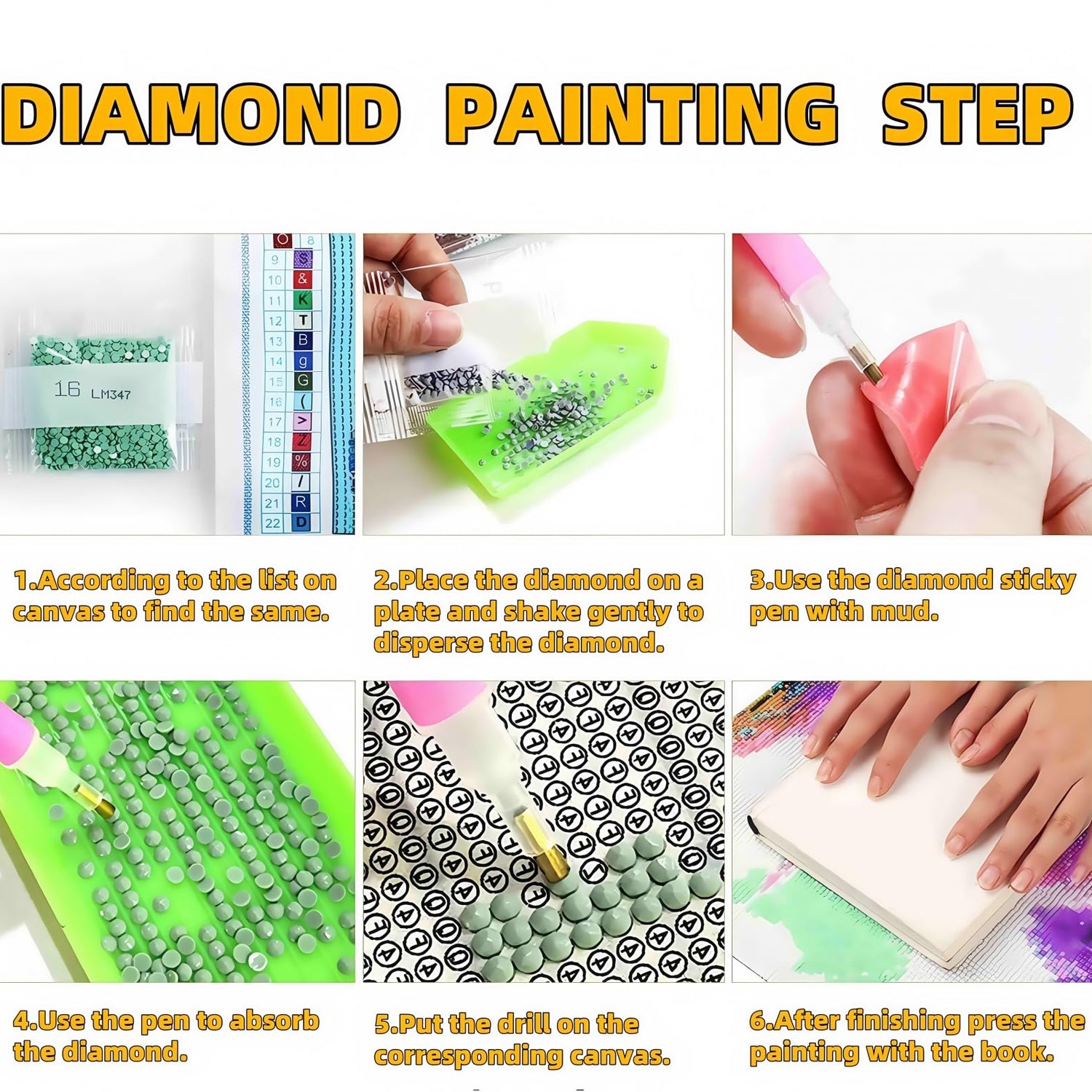 • 3、Diamond Painting Kit: diamond art painting kits have equipped you with all the necessary tools to ensure that you can effortlessly complete diamond painting for adults. diamond dots for adults includes 1 canvas,1 tray,1 wax,4 self sealing.