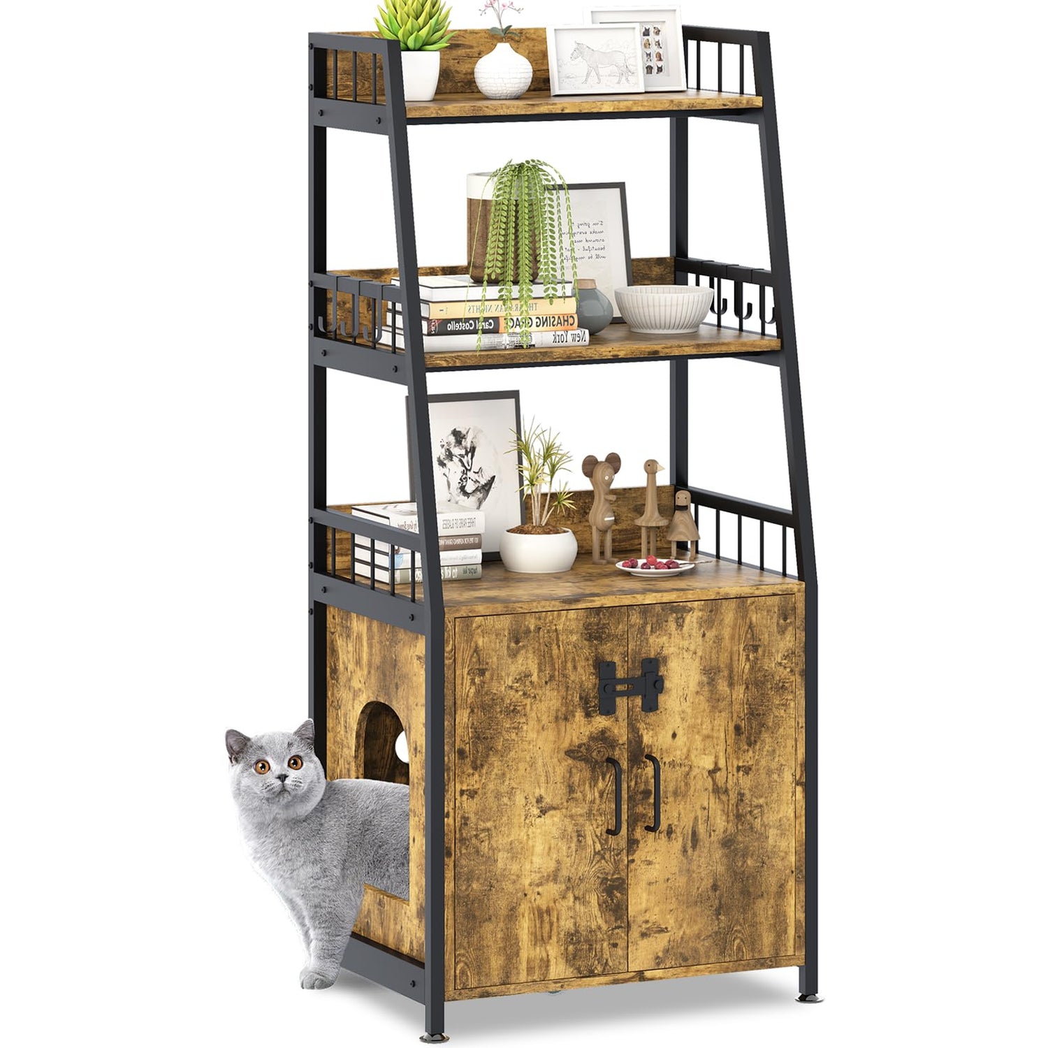 - All-in-one Cat Litter Box Furniture:This cat litter box enclosure with Shelves,Double shelves can hold magazines,books, photo frames, potted plants, Cat food,etc; it also discreetly hide the litter box to make your home neat and comfortable! Large space keep your room free of litter exposure and spills so you can no longer find cat poop in your home.