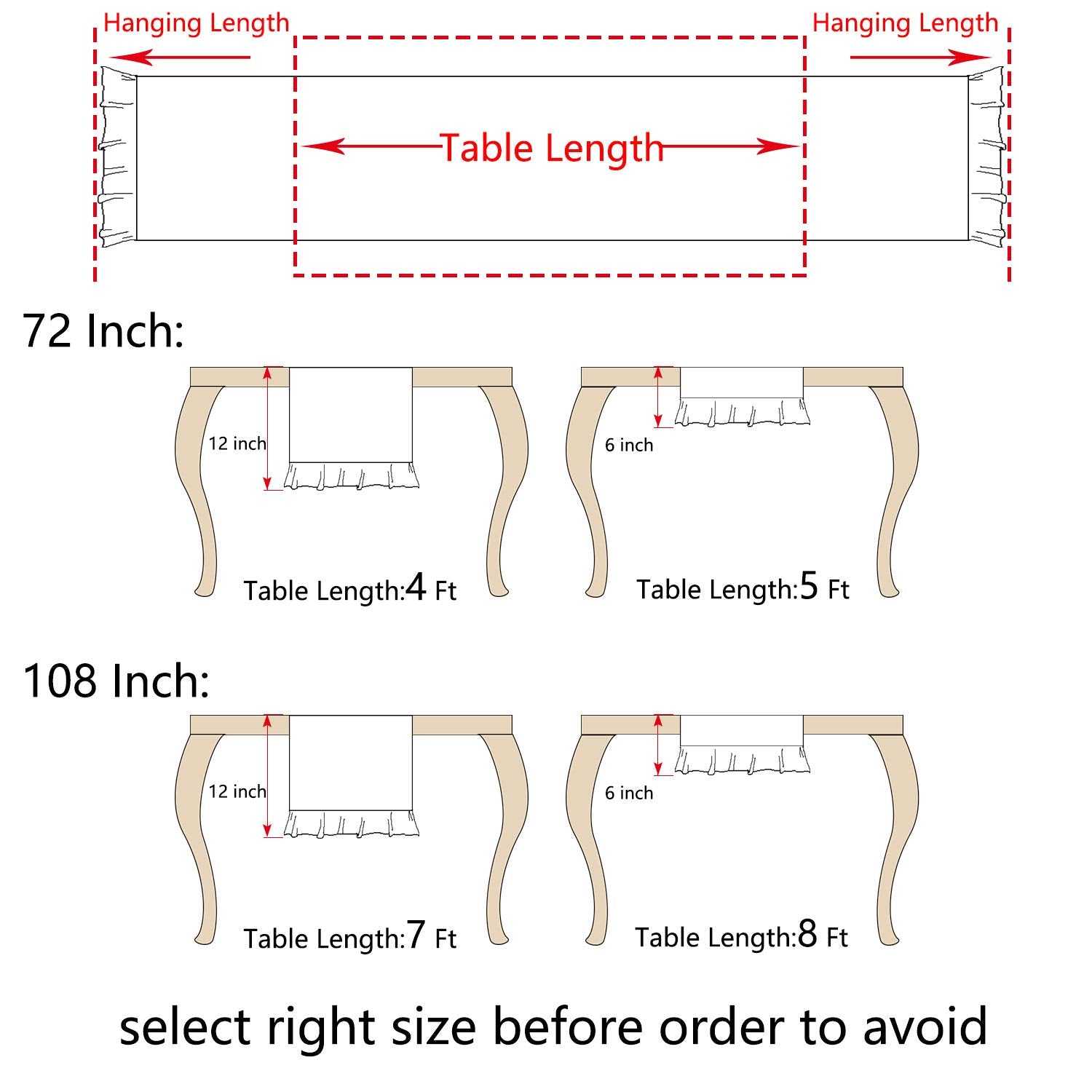 - Approx. 12'' Wide x 72'' Length(the length include two 4-inch ruffle edges) best used on 3-5ft table.