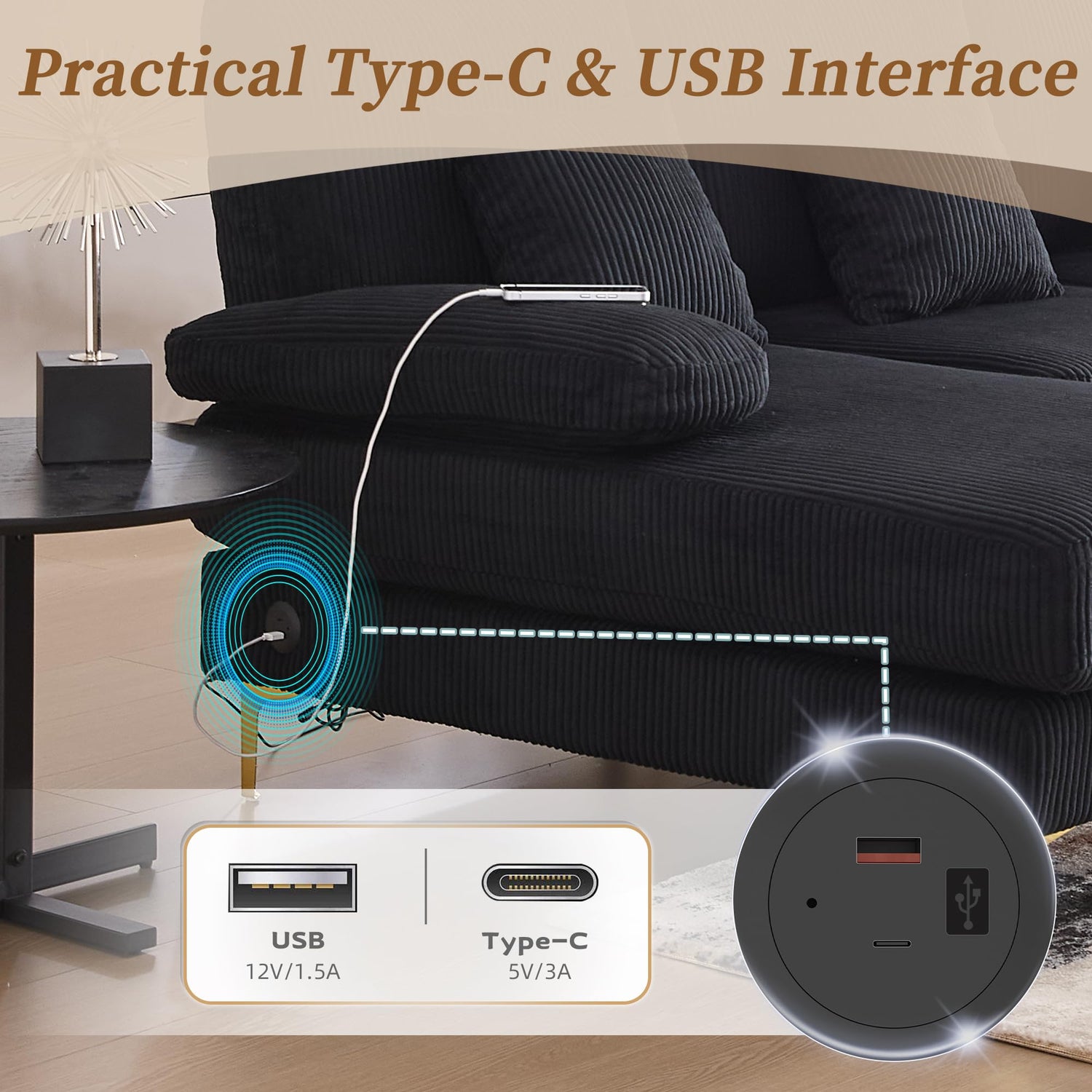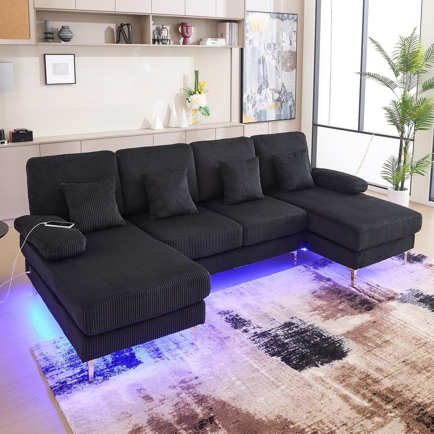 - Smart Charging & Mood Lighting: Enjoy modern convenience with integrated dual USB + Type-C charging ports. Set the perfect ambiance using the remote-controlled LED light system illuminating the sofa base.