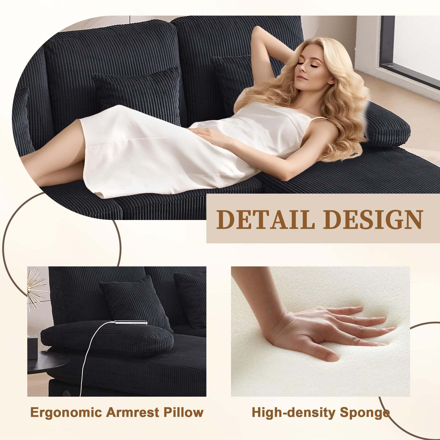 - Sturdy Build & Spacious U-Shape: Built on a robust engineered wood frame with reinforced golden iron legs (800lb weight capacity) for exceptional stability. The modular 3-piece U-shaped design (Left Chaise + Right Chaise + 2-Seater Sofa) comfortably seats 6.
