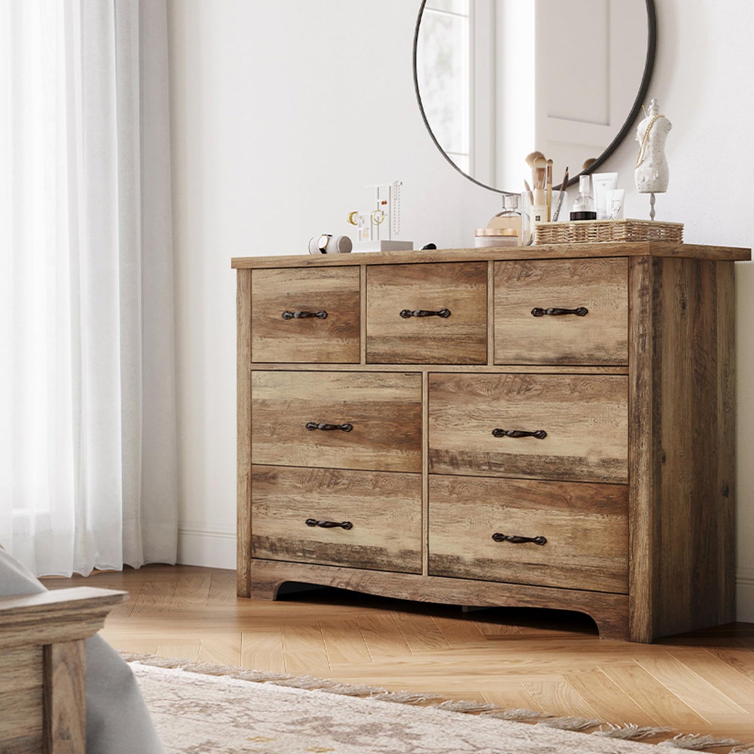 LINSY HOME 7 Drawers Dresser for Bedroom, 47" Wide Rustic Wood Dressers & Chests of Drawers, Modern Farmhouse Storage Dresser with Antique Handles for Closet, Living Room, Hallway, Rustic Brown