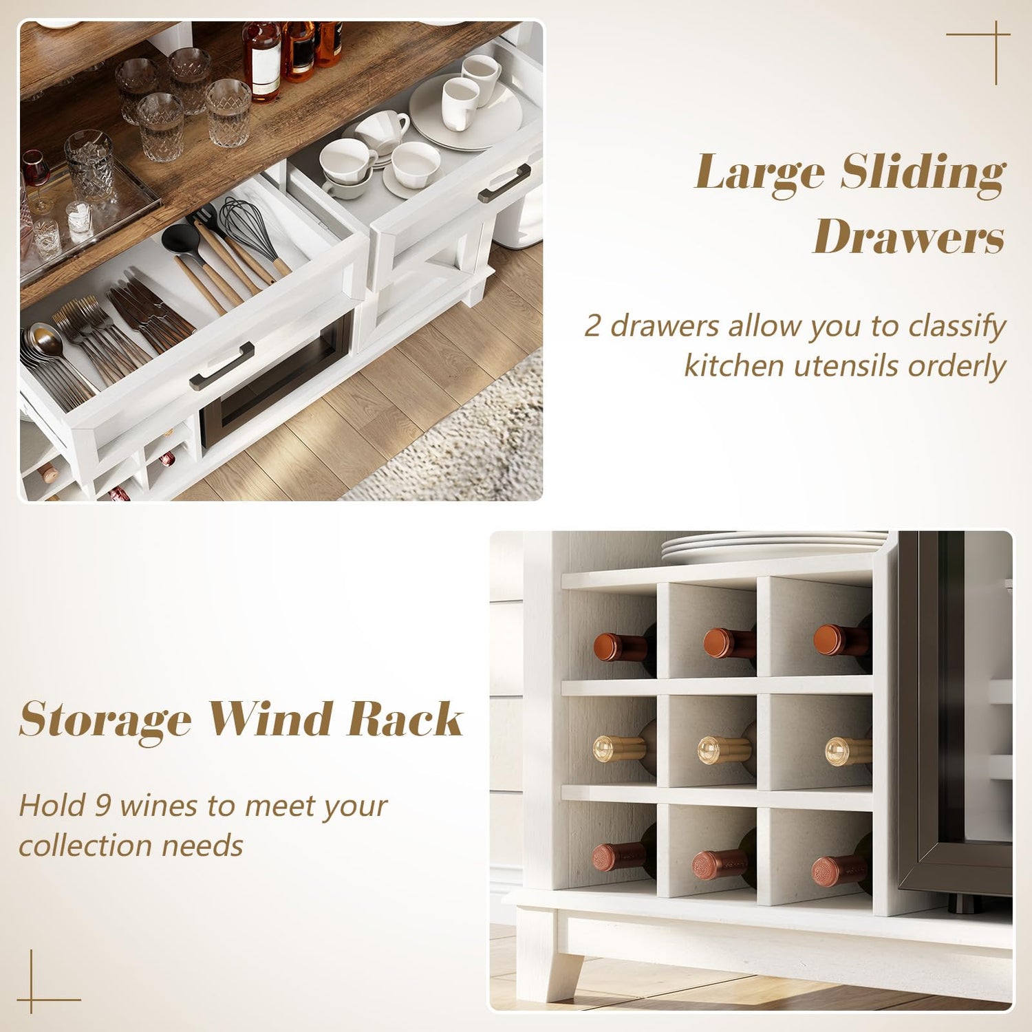 - [Ample Storage Bar Hutch] Spacious 2-tier tabletop & 2 drawers provide enough space; Barn door cabinet features adjustable shelf to customize storage, 2-row glass holders for 8 glasses & 9-grid wine racks to keep your wine stored in an ordered way