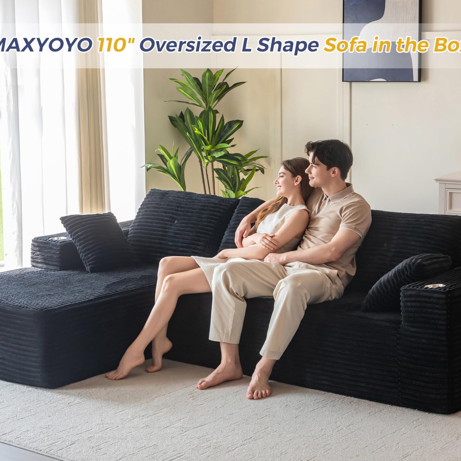 MAXYOYO 104" Modular Sectional Couch with L-Shape Chaise, Modern Boneless Couch for Living Room, Sofa in A Box, Oversized Sofa Sleeper with Deep Seat, No Assembly Required, Black