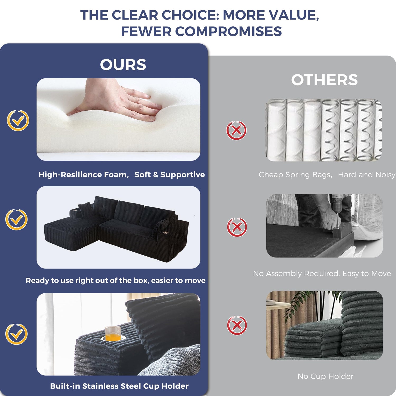 - High-resilience Foam Filling: The sectional couch is filled with whole piece of high-density elastic sponge inside, providing good support and enjoying a cloud-like comfortable sitting experience. Backrests and pillows provide lumbar and neck support to relieve fatigue, relax your body and experience a relaxing rest time. The handmade tufted button craft highlights a light luxury texture and embodies the aesthetic of home comfort