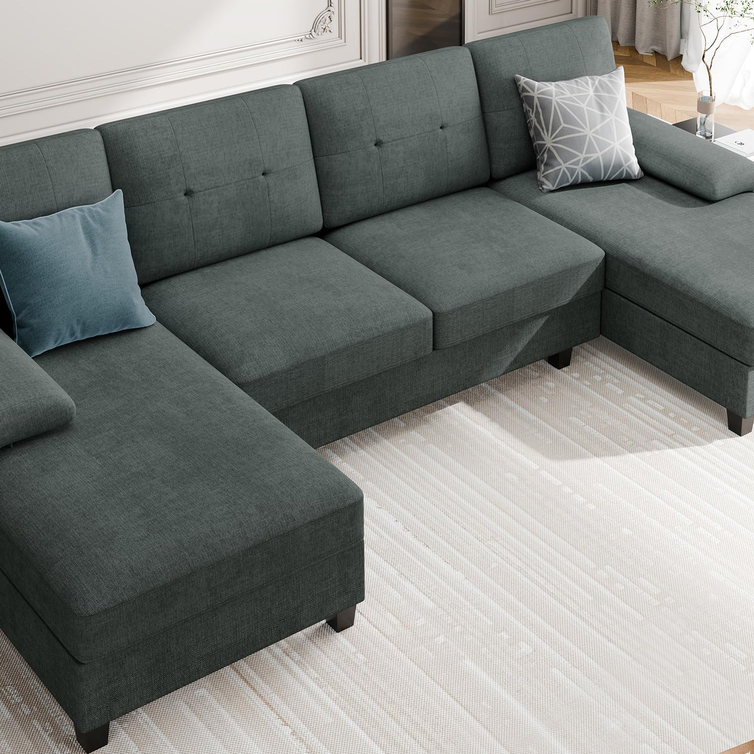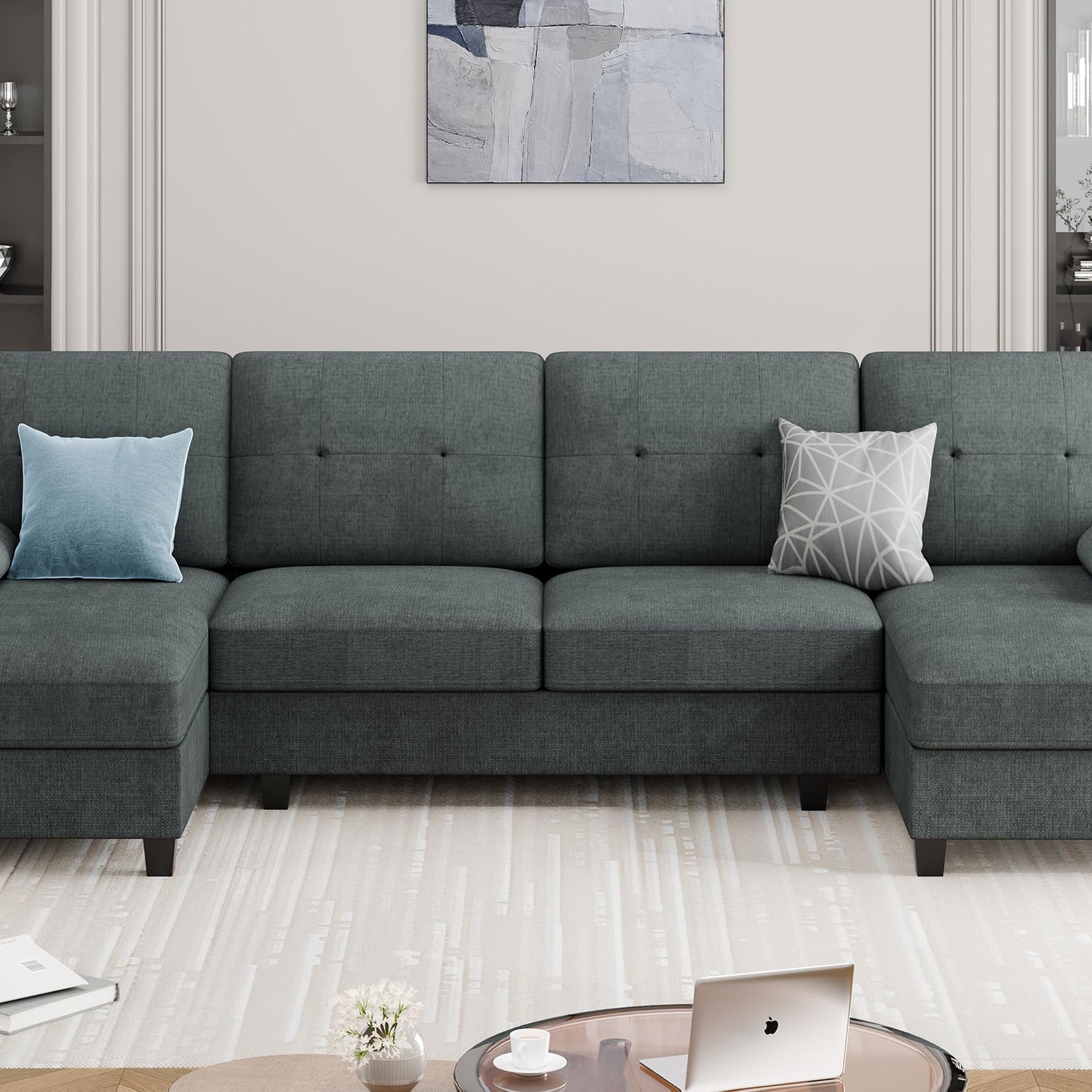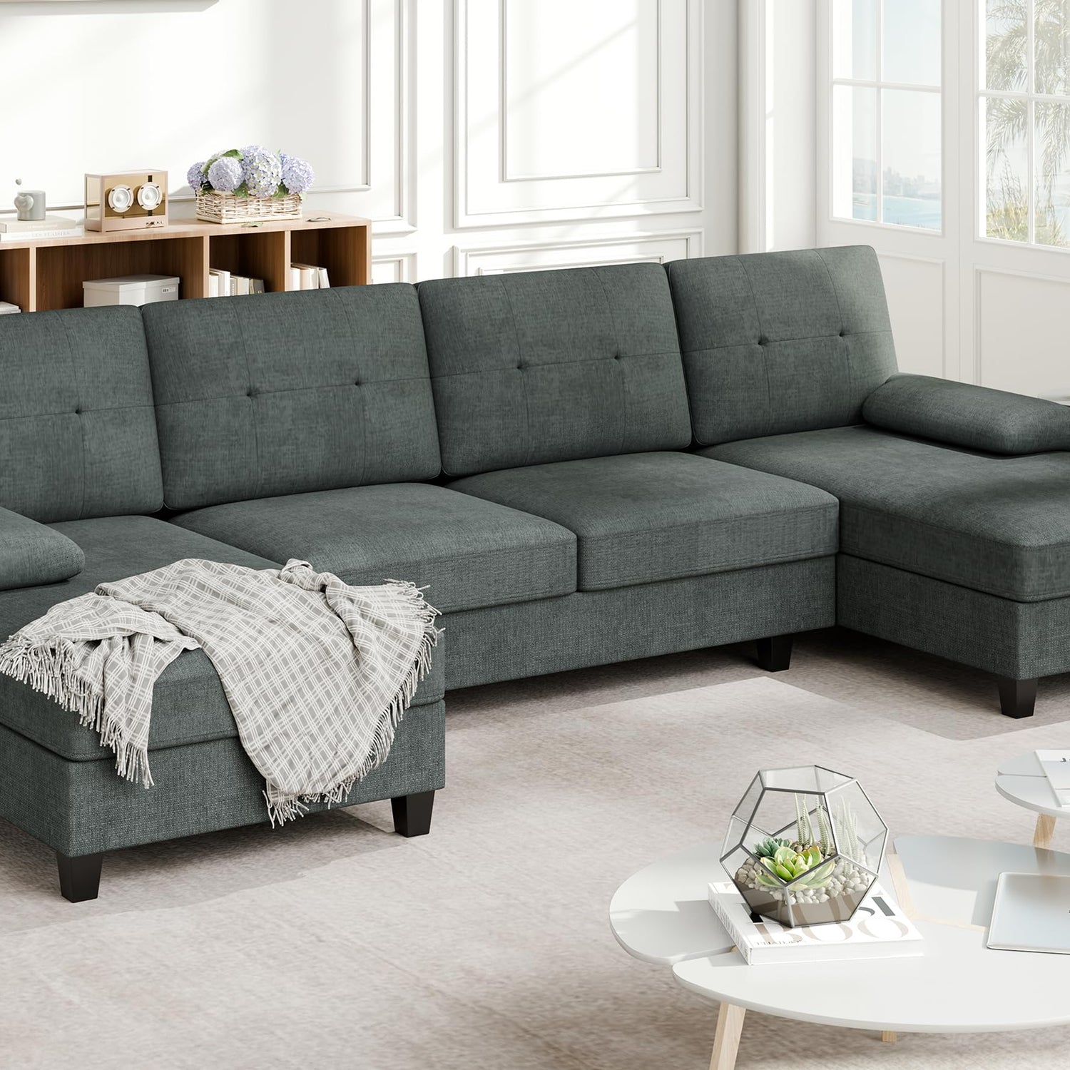 - [HIGH QUALITY] Wood frame and breathable fabric surface, this couch is definitely sturdy for long-time use. 300lbs for each seat. Overall dimension of this couch: 106.3" x 50.4" x 33.9". Seat height: 16.1". With 2 wide chaise lounges, the sectional couches for living room can seat up to 4 people together