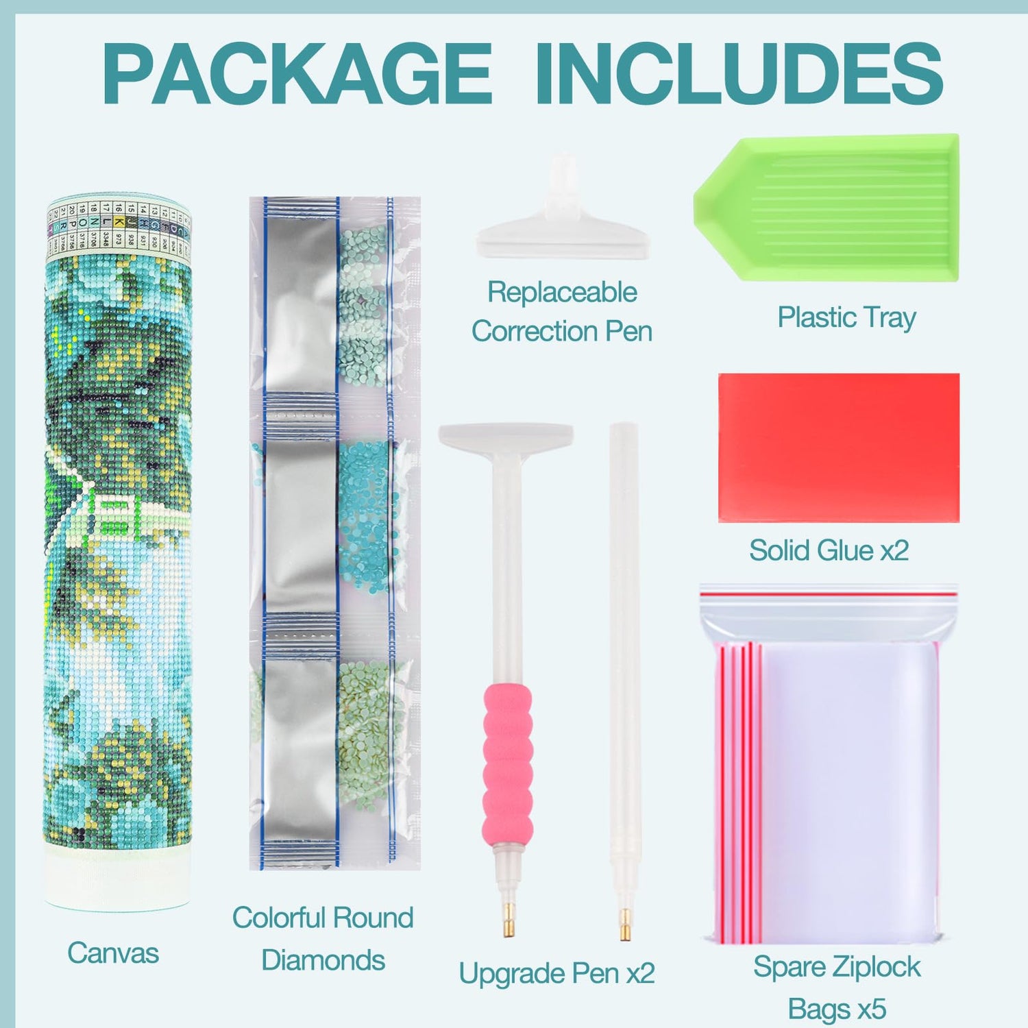 - DIAMOND PAINTING KIT INCLUDES: Each Diamond Painting comes with all the tools needed, you will receive the following tools 1x canvas, 2x diamond pens, 1x diamond tray, 1x glue clay, 1x replaceablecorrection pen, 5x ziplock bags for diamonds and enough colorful diamonds to start your wonderful DIY experience