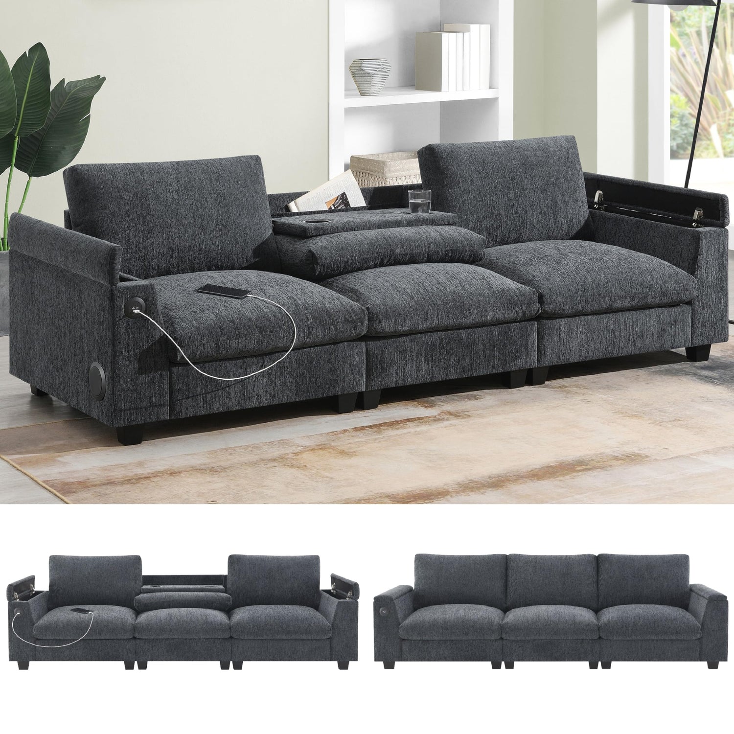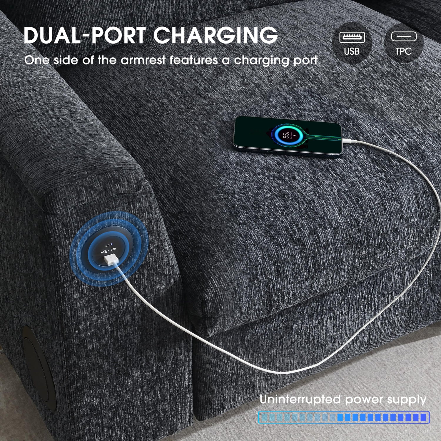 - USB Charger: With USB ports, this sofa offers a convenient way to charge your devices while relaxing. Whether you're charging your phone, tablet, or e-reader, you won’t need to get up and search for an outlet. The USB ports are easily accessible, providing quick and easy access to power without cluttering up the area with extra cables or adapters. This feature is perfect for today’s tech-savvy users who need their devices charged at all times.