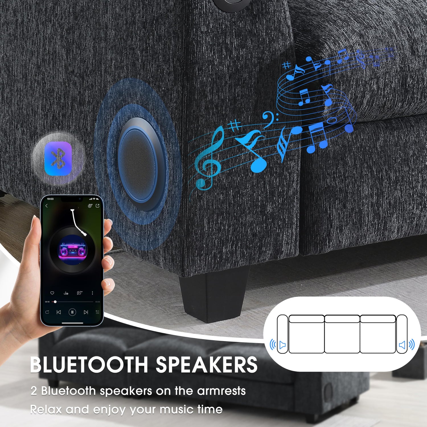 - Bluetooth Speakers: The sofa comes equipped with Bluetooth speakers, offering a modern touch to your living room. Simply pair your phone or other Bluetooth-enabled devices to the speakers, and you can enjoy music, podcasts, or even immersive sound effects from your favorite shows or movies directly from the sofa. This feature eliminates the need for extra audio equipment, creating a cleaner, more streamlined look while enhancing the entertainment experience.