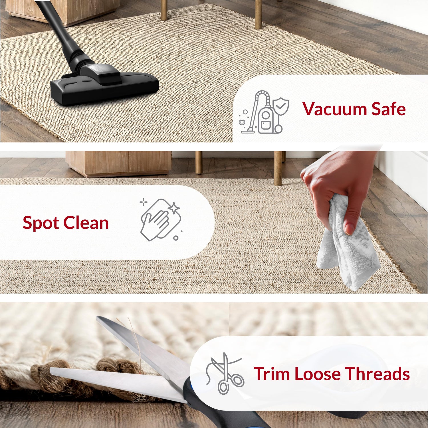 - Rug Care: Vacuum your area rug a few times a week on the lowest setting and spot clean with mild detergent. Sprouting and debris are common due to being made from plant fibers, trim any loose threads with scissors and regularly clean under your rug.