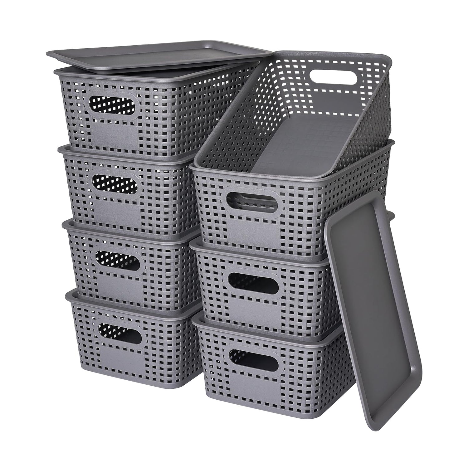 Plastic Storage Baskets with Lid-Plastic Storage Containers Stackable Storage bins: Storage Baskets for Organizing Shelves Drawers Desktop Closet Playroom Classroom Office, 8Pack-Gray,10.2x7.2x4.1Inch