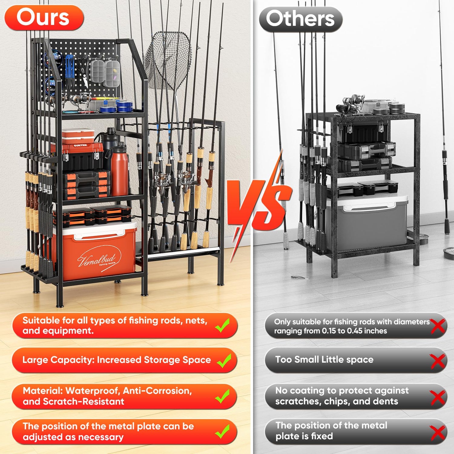 - High-Quality Heavy Metal Material: This fishing rod storage is constructed from premium, industrial-grade metal. The robust iron frame provides exceptional strength and stability, eliminating any risk of toppling. Our fishing rod racks are designed to be both sturdy and durable, with a maximum load capacity of 200 pounds. This organizer serves as a reliable and long-lasting storage solution for your fishing equipment.