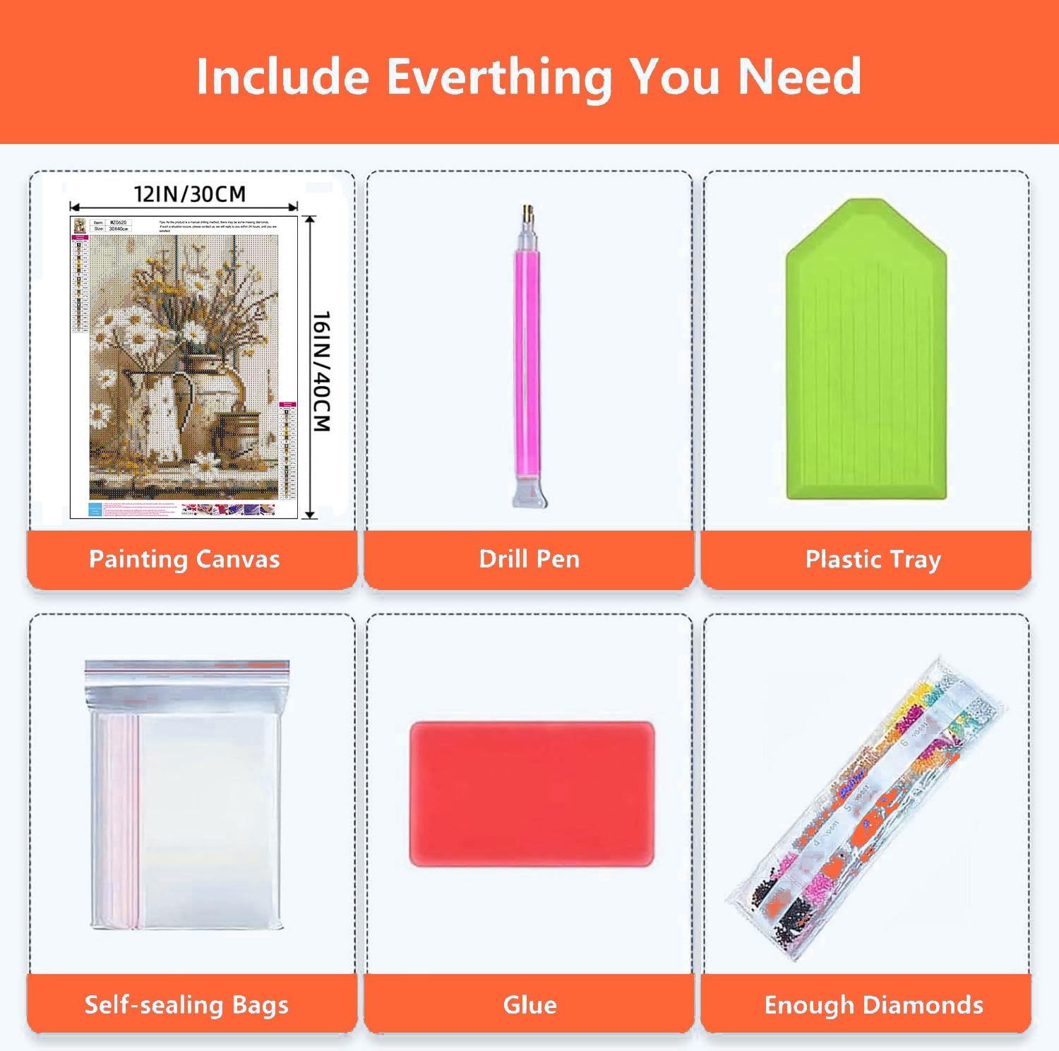 - 【5D Diamond Painting Kits for Adults】12x16in flowers diamond painting, 1*color coded rhinestones, 1*point diamond pen, 1* diamond tray, 1*red glue clay, several plastic bags to store the diamonds, enough colorful round diamonds, we'll provide 30% diamond more than need.