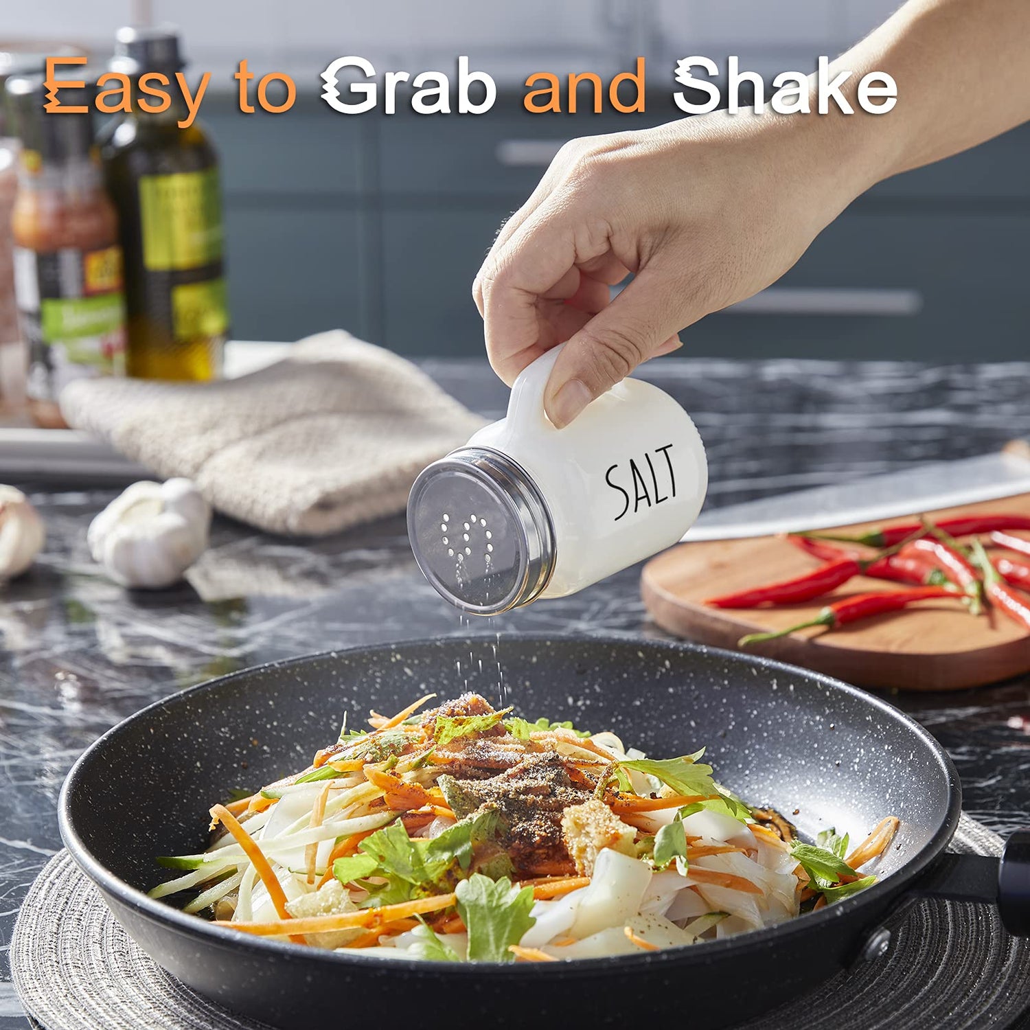 - For Your Everyday Use: Each salt and pepper shaker holds about 4 ounces, they are the perfect size for frequent use and less frequent refillings. Letters on lid and words on side of container allows you two ways to affirm which spice is inside. This set of salt and pepper shakers are great for cooking to dispense or table use when you are eating.
