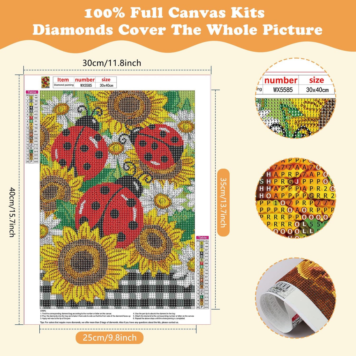 - Ladybug Diamond Art Size And Package: 12 "x16" full Ladybug diamond Diamond art,Include 1*high definition painting canvas, 2*point diamond pen, 1*cube diamond tray, 1*red glue clay, 1*pen cap, 5*valve bags.enough colorful round diamonds