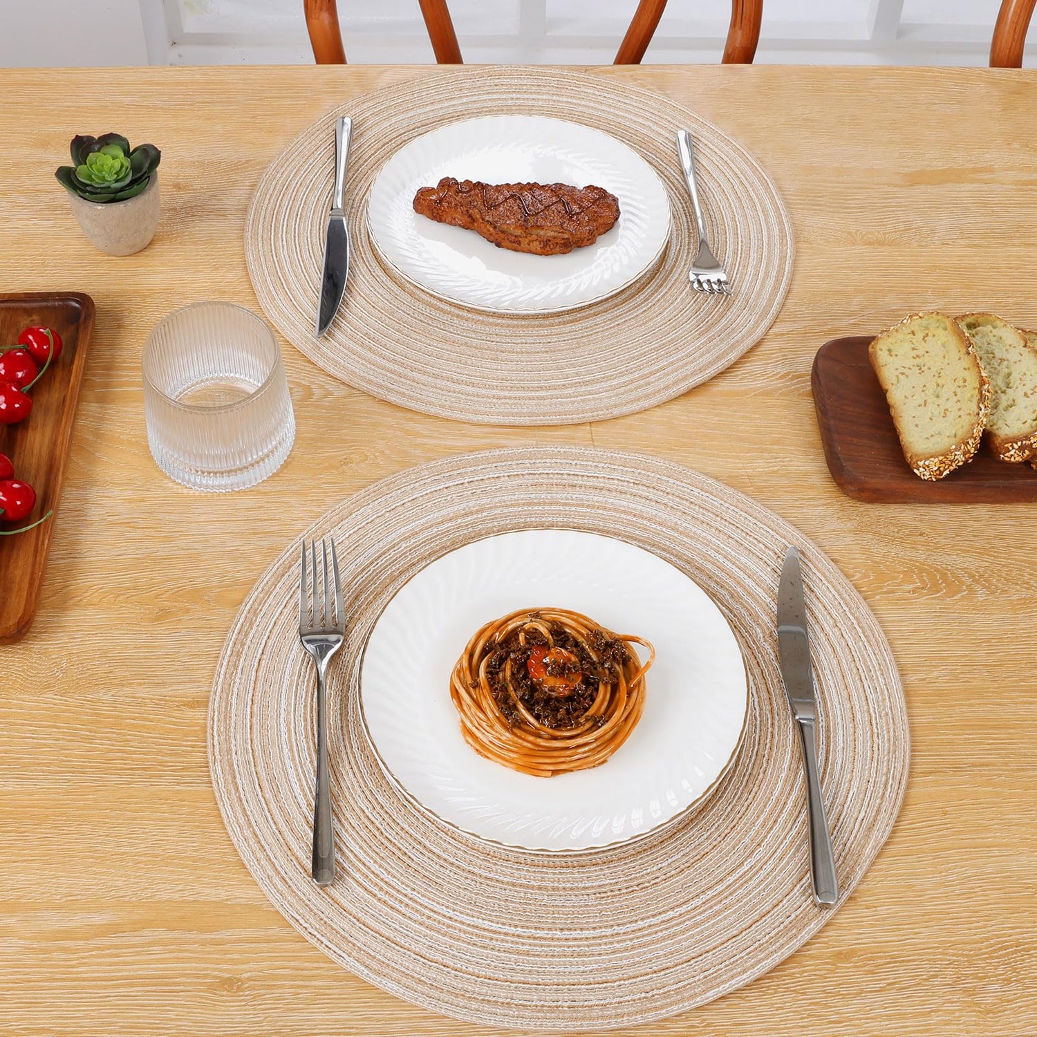 SHACOS 15 inch Round Braided Placemats Set of 6 Non Slip Heat Resistant Cotton Polyester Table Mats Washable Place Mats for Kitchen Dining Party Table Decor (Beige, 6)