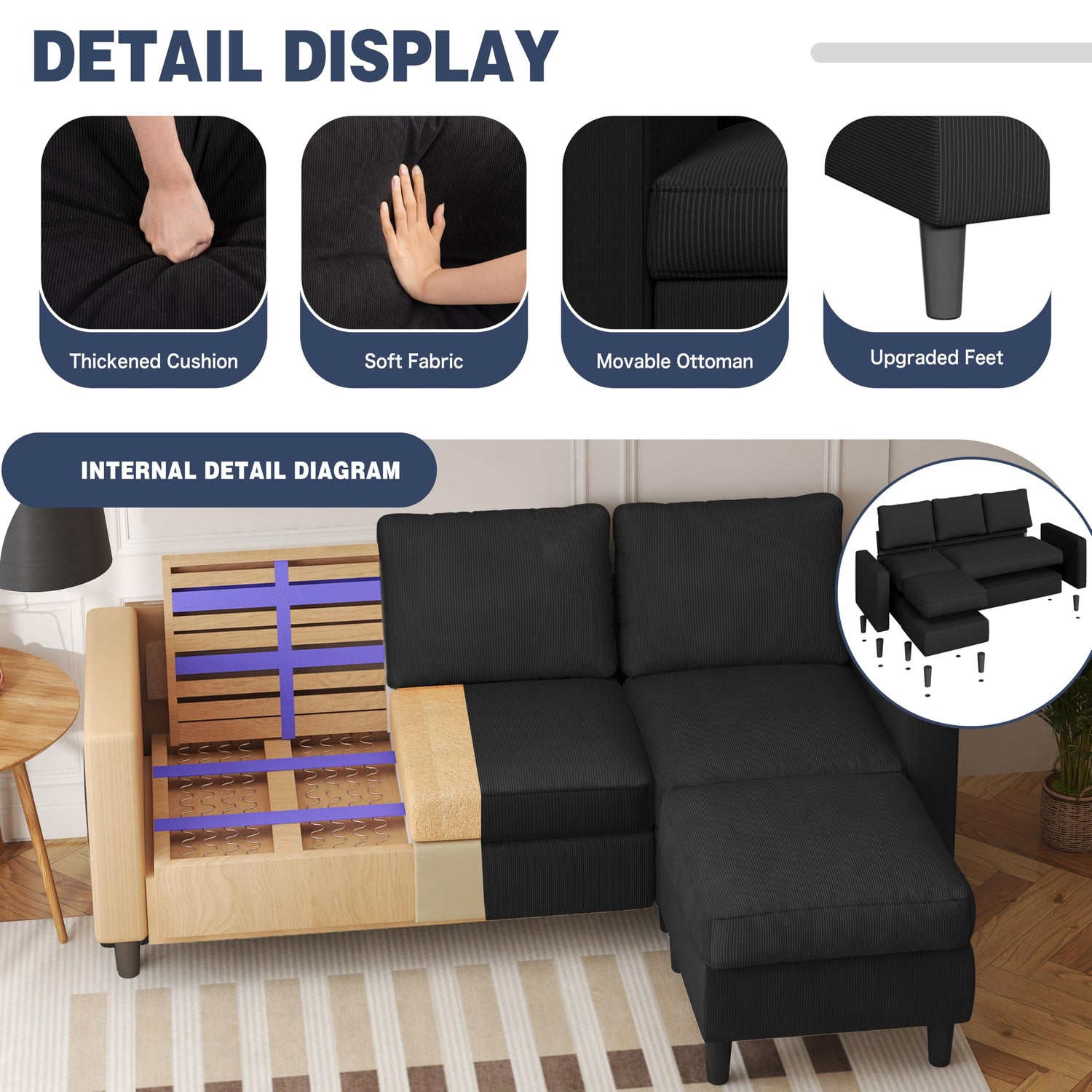Shintenchi Small Sectional Sofa Couch, 3 Seat L Shaped Couches with Ottoman, Upholstered Corduroy Convertible Sofa, Small Couch for Apartments, Living Room and Office (Black)