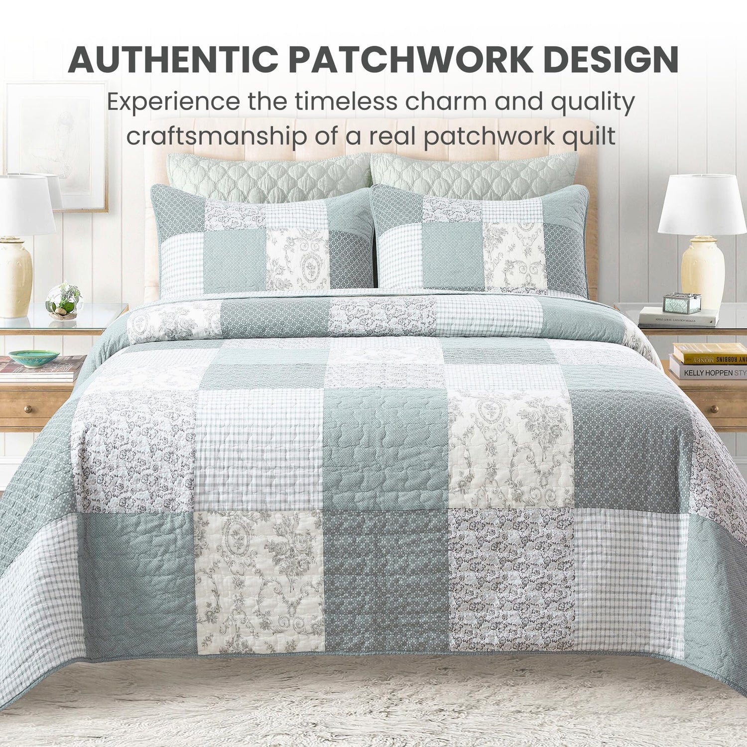 - NEUTRAL DESIGN FOR ALL DECOR SCHEMES: This gorgeous bedding set would look fabulous in any room. With its traditional patchwork style and neutral shades of grey and sage green, it’s guaranteed to brighten every space, whether your décor style is traditional or modern.