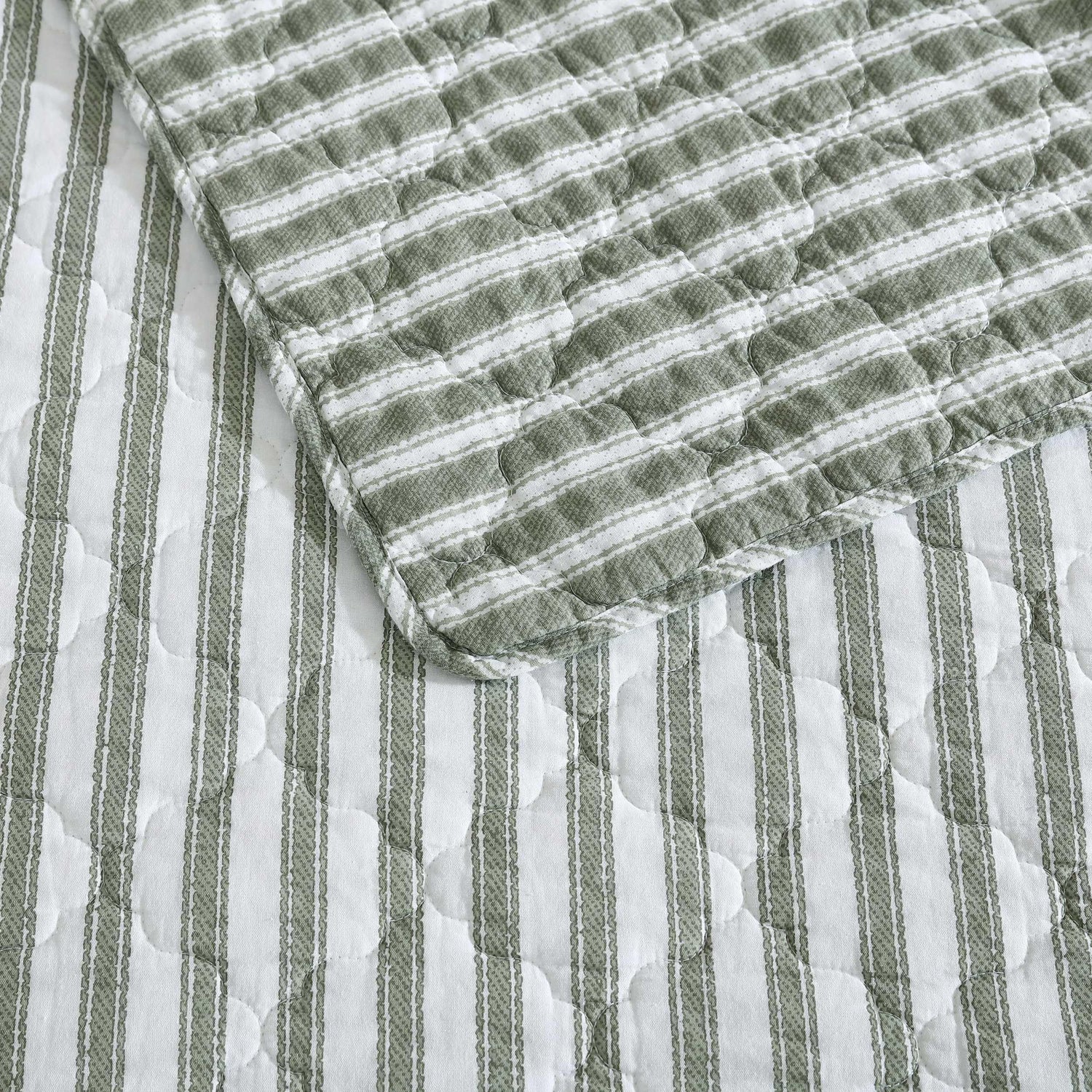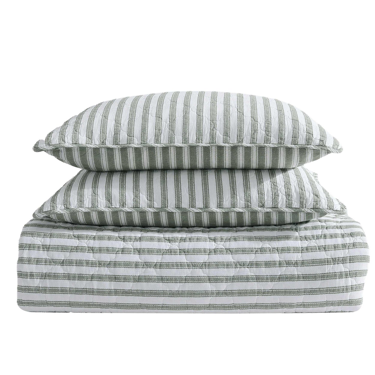 Details: The Stone Cottage Willow Way Striped Quilt Set is perfect on its own or as a layering piece. This reversible quilt features a sage stripe on an ivory quilted ground on the front and the inverse ivory stripe on a sage ground on the reverse. This quilt is 100% cotton, with a cotton (80%)/polyester (20%) filling is lightweight and easy to layer. The corners of the quilt are rounded to match the sham. Edges are finished with a fabric binding. We have reduced our packaging, eliminating all plastic- your quilt set will arrive secured with a ribbon. The set includes one quilt and two shams (one sham for the twin set). Ensemble is machine washable for easy care.