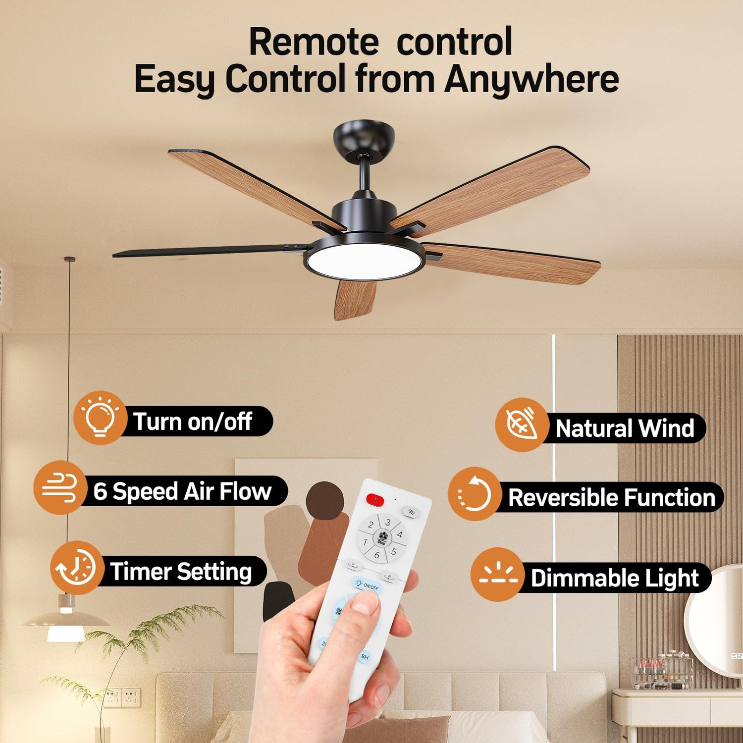 - Multifunctional remote control:With this remote control,you can easily adjust the color temperature of the light and the speed of the ceiling fan anywhere in the room