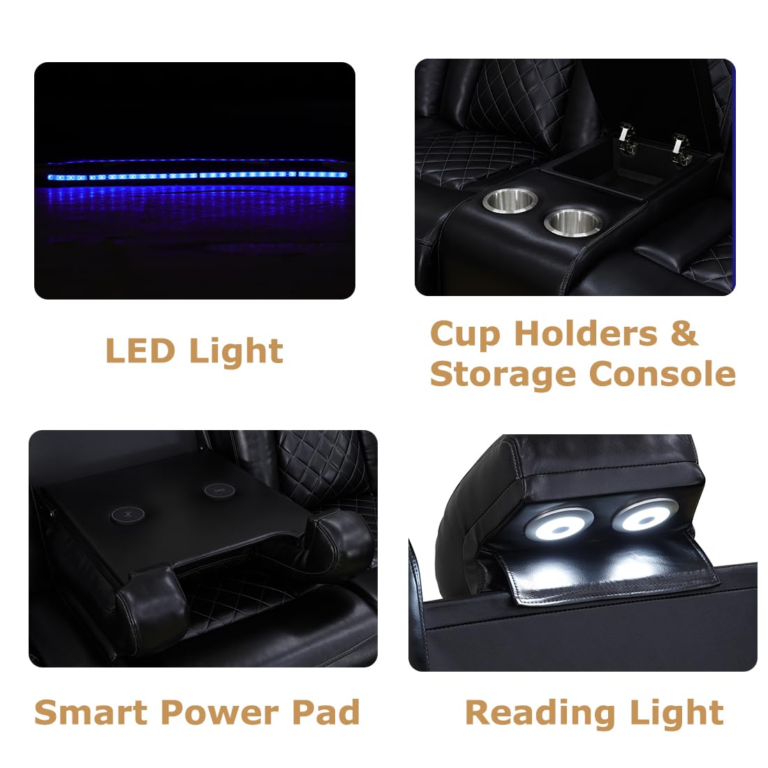 - Multi-functional features: The sofa can adjust the backrest angle through buttons and switch between different modes.The storage console and the cup holders can hold beverages and cups, which is convenient and practical.It is equipped with drop down table in the middle.The smart power pad on the drop down table can recharge the mobile phone at any time.To satisfy the visual impact, it is equipped with LED ambient lights at the bottom.