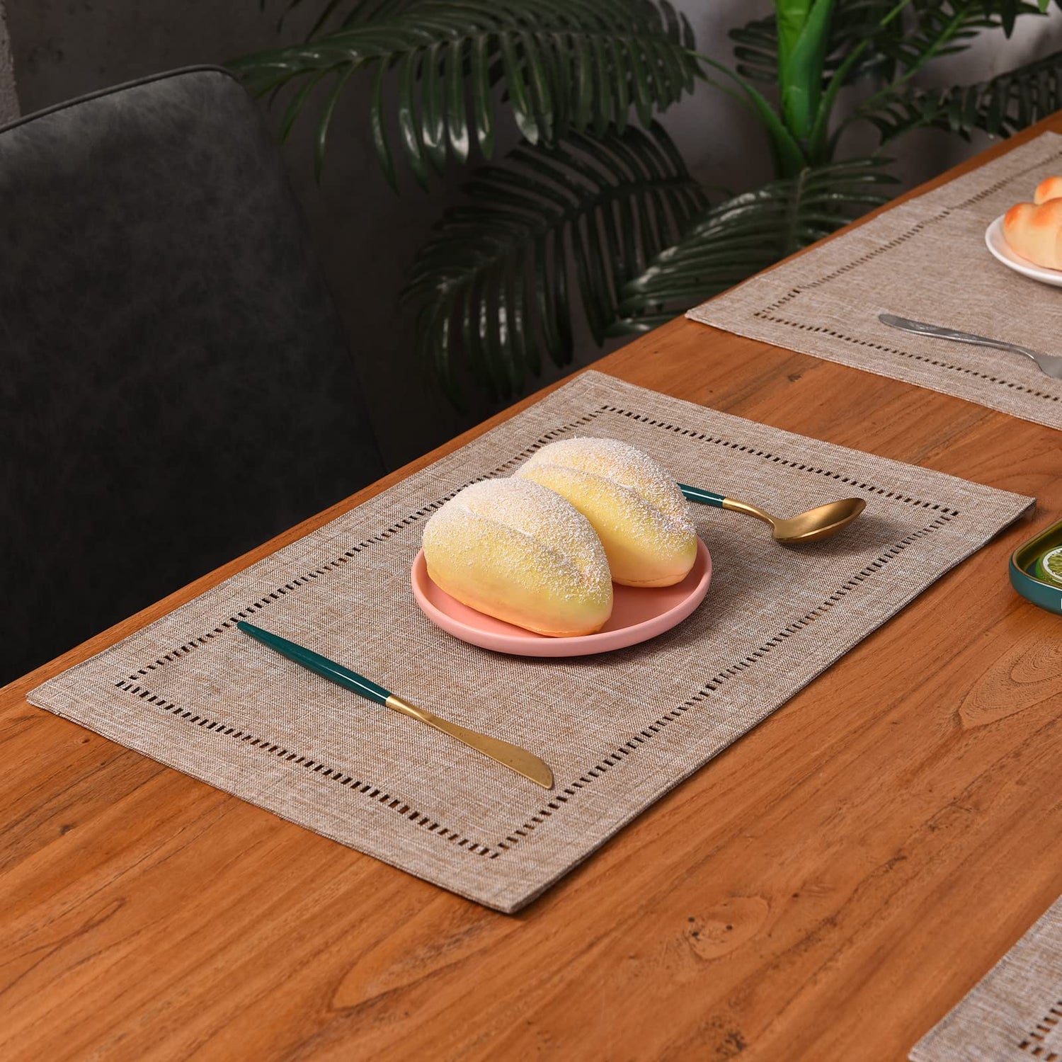 Tosewever Set of 4 Decorative Linen Placemats 12 x 18 Inches, Farmhouse Style Table Mats for Everyday Dining Wedding Party Holiday Home Decor (4 Pieces 12 x 18”, Light Coffee/Straight)