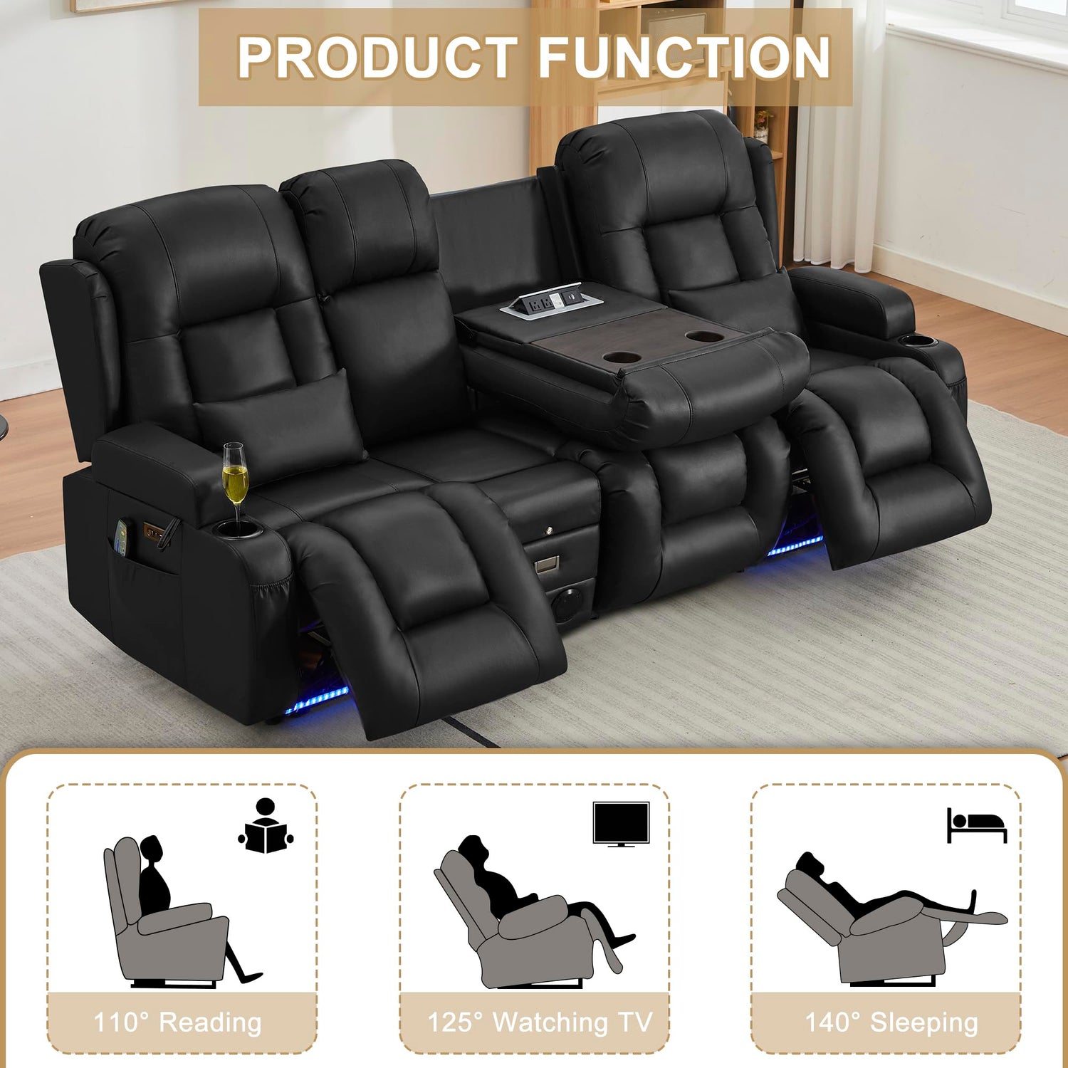 URRED Loveseat Recliner Sofa with Massage and Heat, Power Reclining Loveseat Sofa RV Couch with Console and Middle Seat, 3-Seater Home Theater Seating with LED Lights, Faux Leather, Black