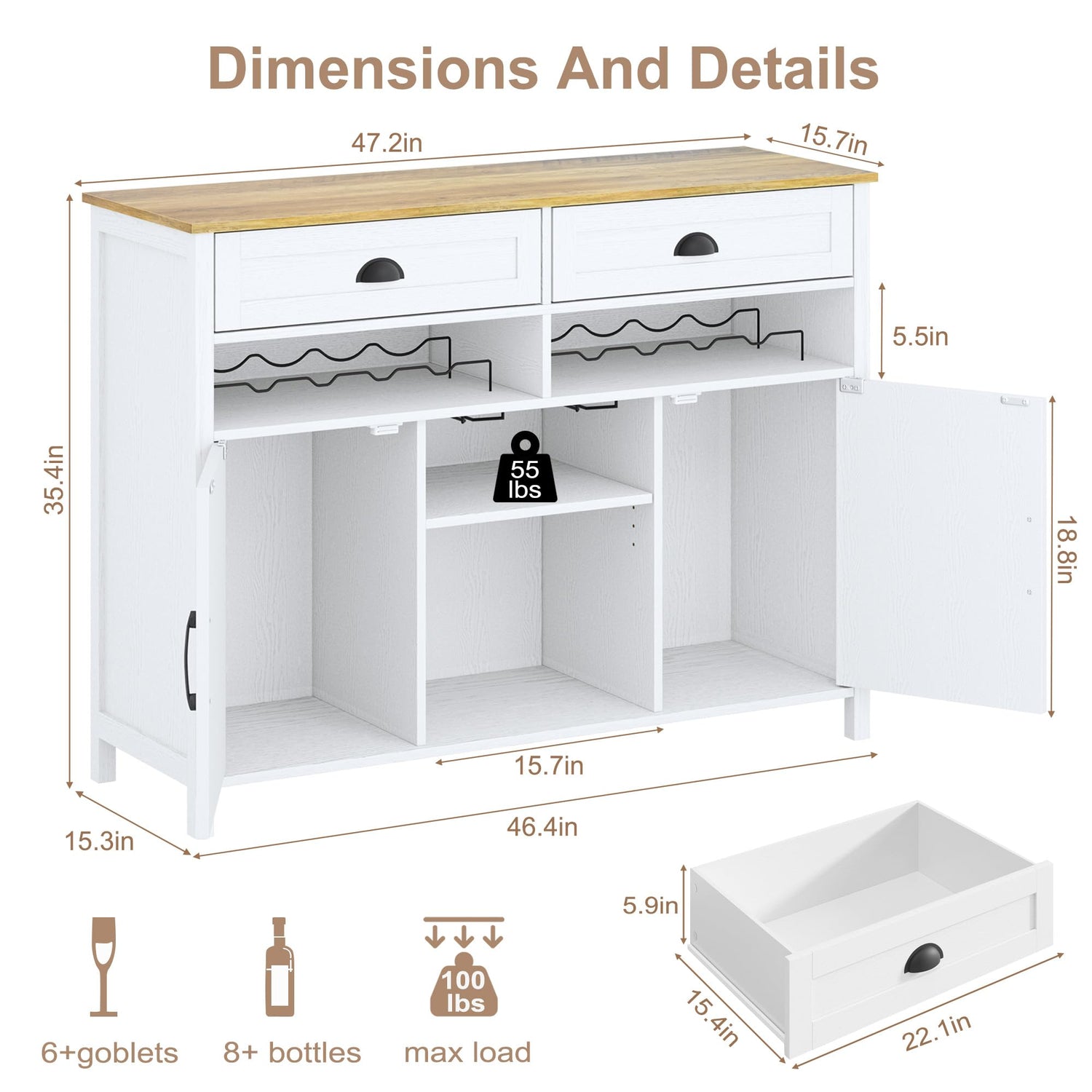 Vividwood 47.2" Modern Farmhouse Wine Bar Cabinet with Wine & Glass Rack, 2 Drawers Buffet Sideboard Storage for Kitchen, Living Room, Dining Room - Coffee & Liquor Station Cabinet (White)