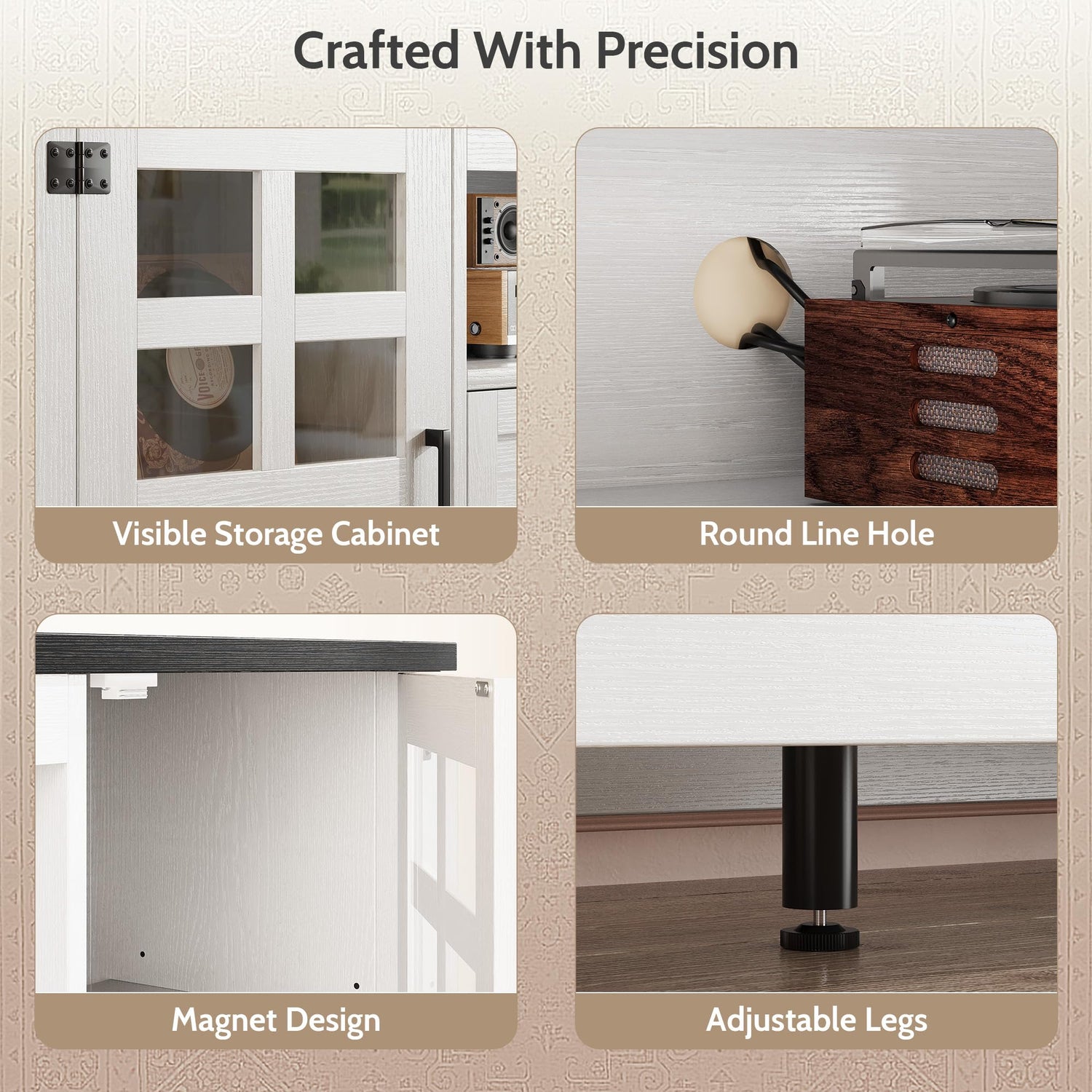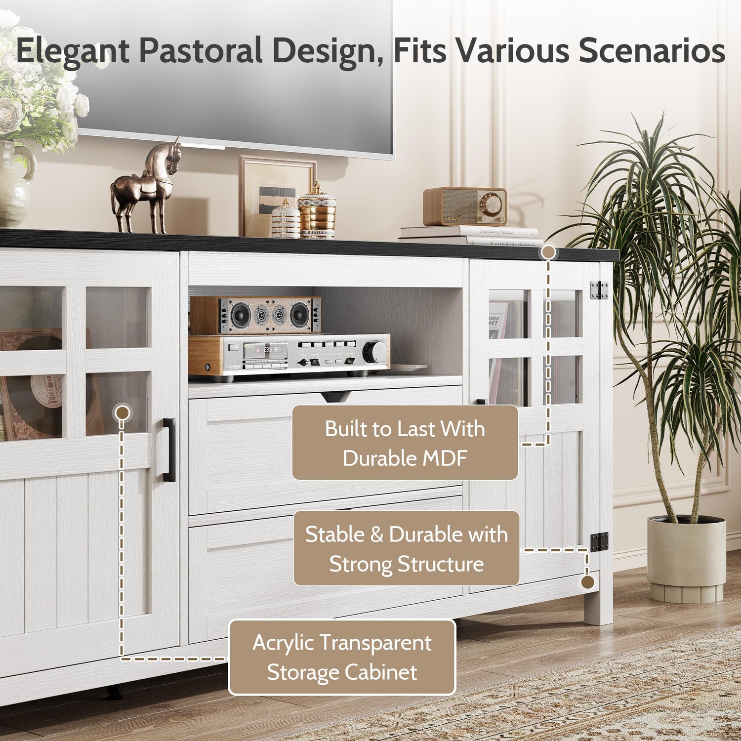 - [Thoughtful Multi-Level Storage] Stay organized with 8 zones: side cabinets, open shelves, a drawer, and wide top. Perfect for books, consoles, or décor, this Vividwood media console offers versatile storage that keeps your home neat and inviting