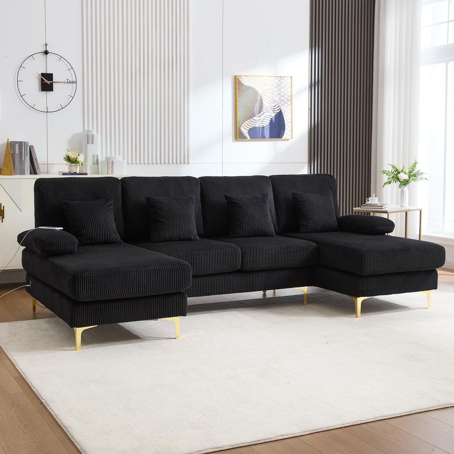 VYNELITO U Shaped Sectional Sofa Couch, 4 Seat Sofa with Double Chaise Lounge for Living Room, 104" Comfy Corduroy Couch with USB and Lights, Black Corduroy