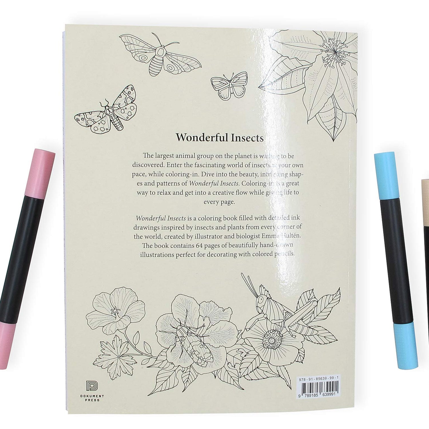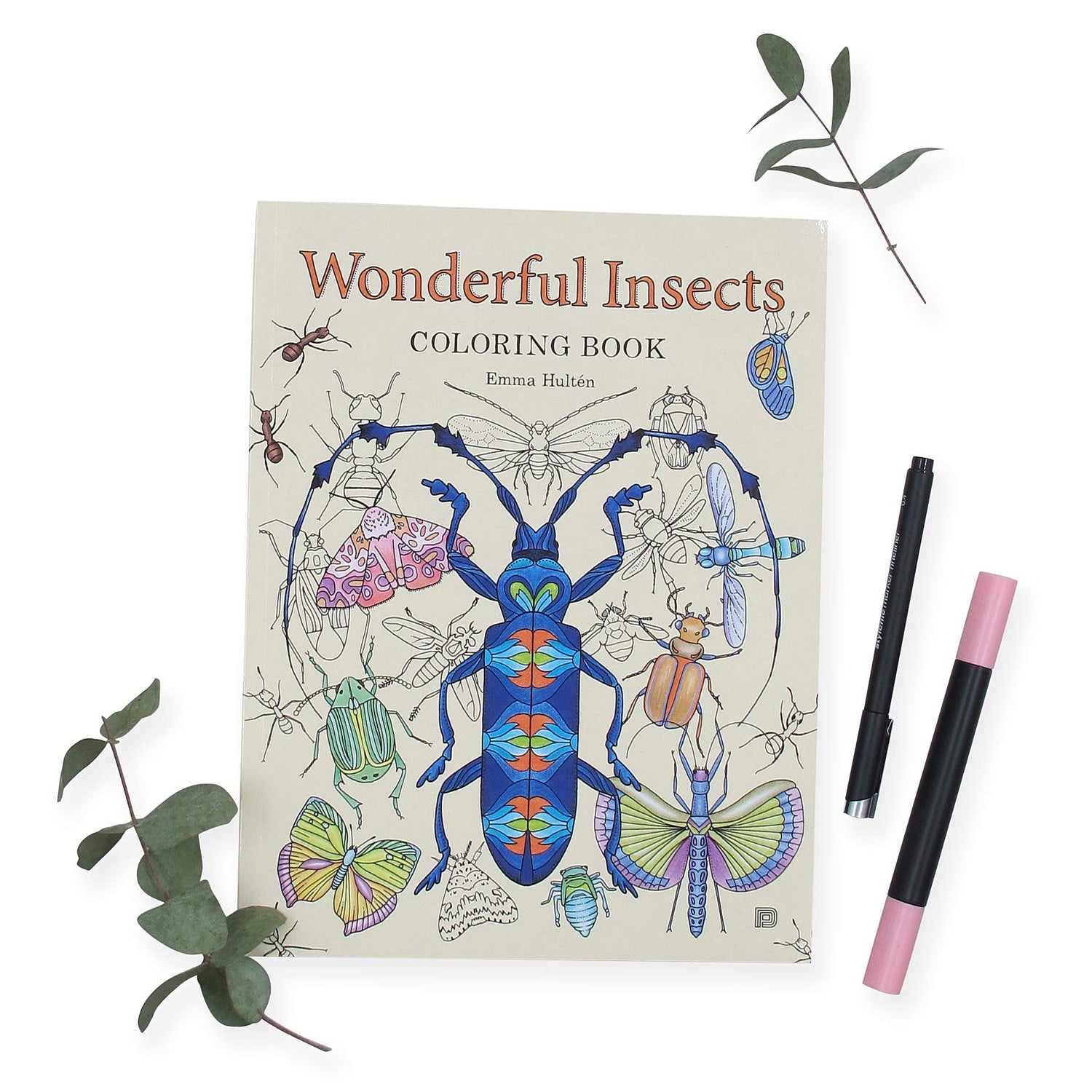 Wonderful Insects is a coloring book filled with detailed ink drawings and patterns inspired by a variety of insects and plants from all corners of the world. The book contains 64 pages of beautifully hand-drawn illustrations created by biologist and illustrator Emma Hulten.