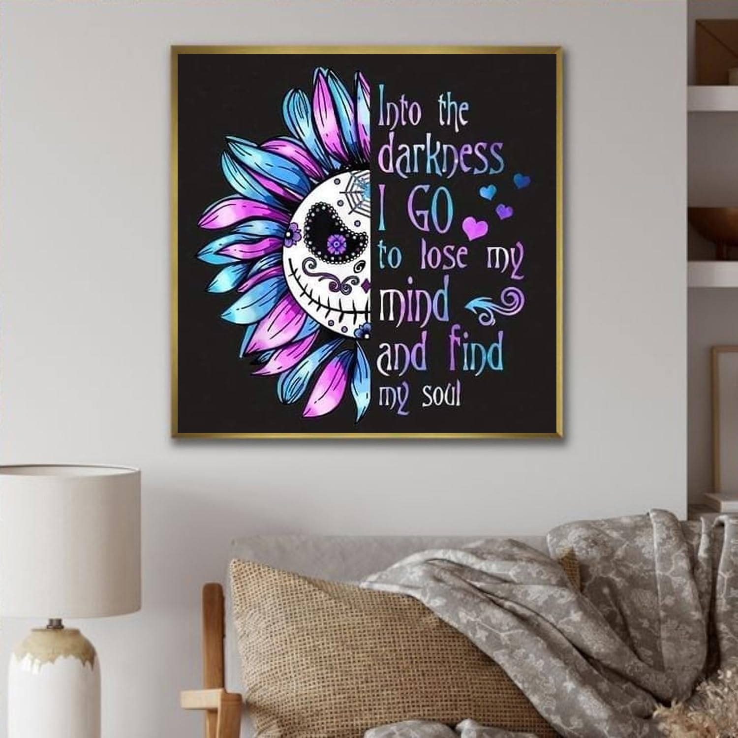 - 【Unique Sugar Skull Design】 Features a colorful Day of the Dead sugar skull combined with vibrant flower mandala petals and the inspirational quote “Into the darkness I go to lose my mind and find my soul”, adding a gothic yet spiritual touch to your home décor.