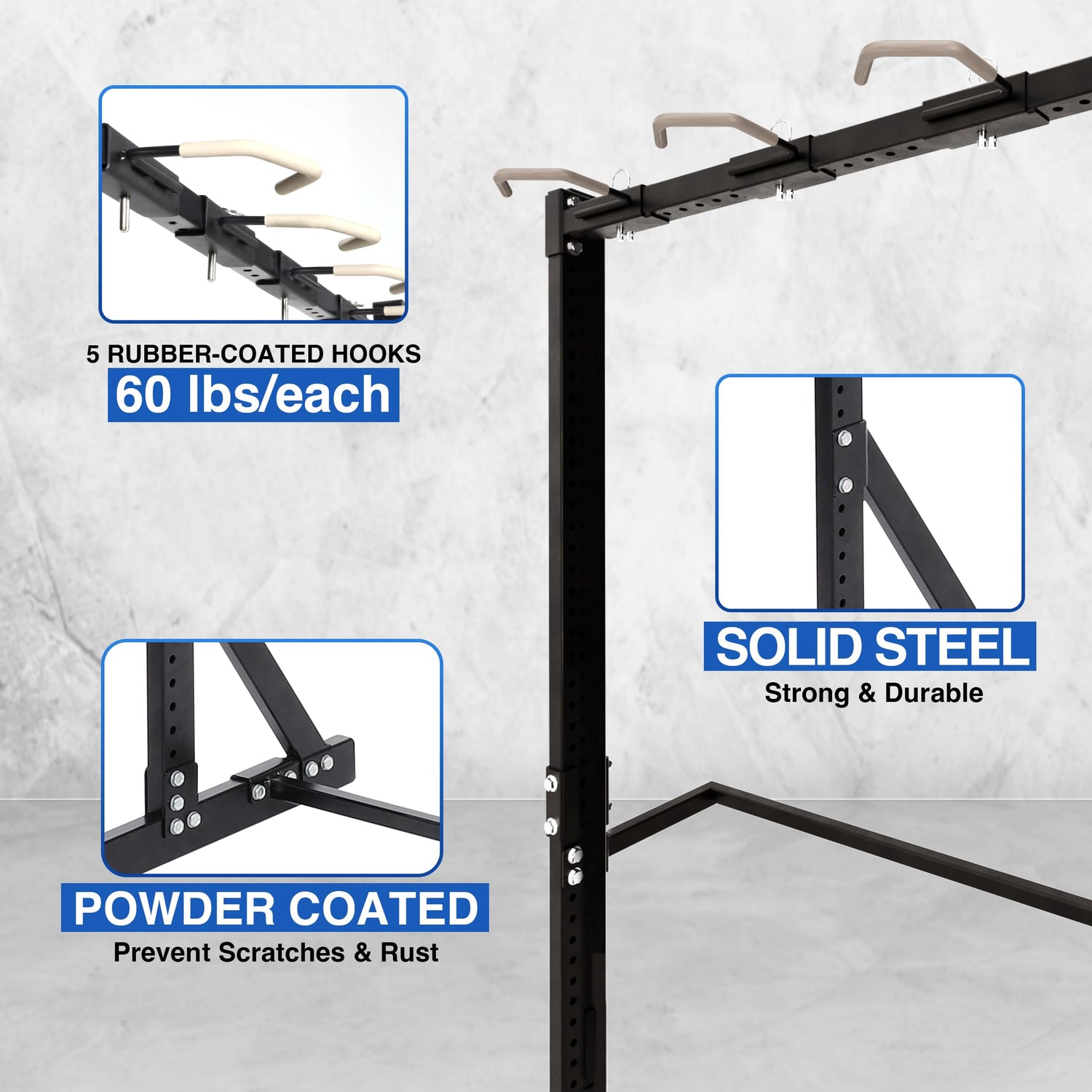 - STRONG AND DURABLE: Yes4All stand up bike rack for garage is sturdy and securely holds up to 300 pounds of bikes; The matte black powder coat protects against scratches and rust; Rubber coated hooks with a 60 pound capacity prevent damage during storage