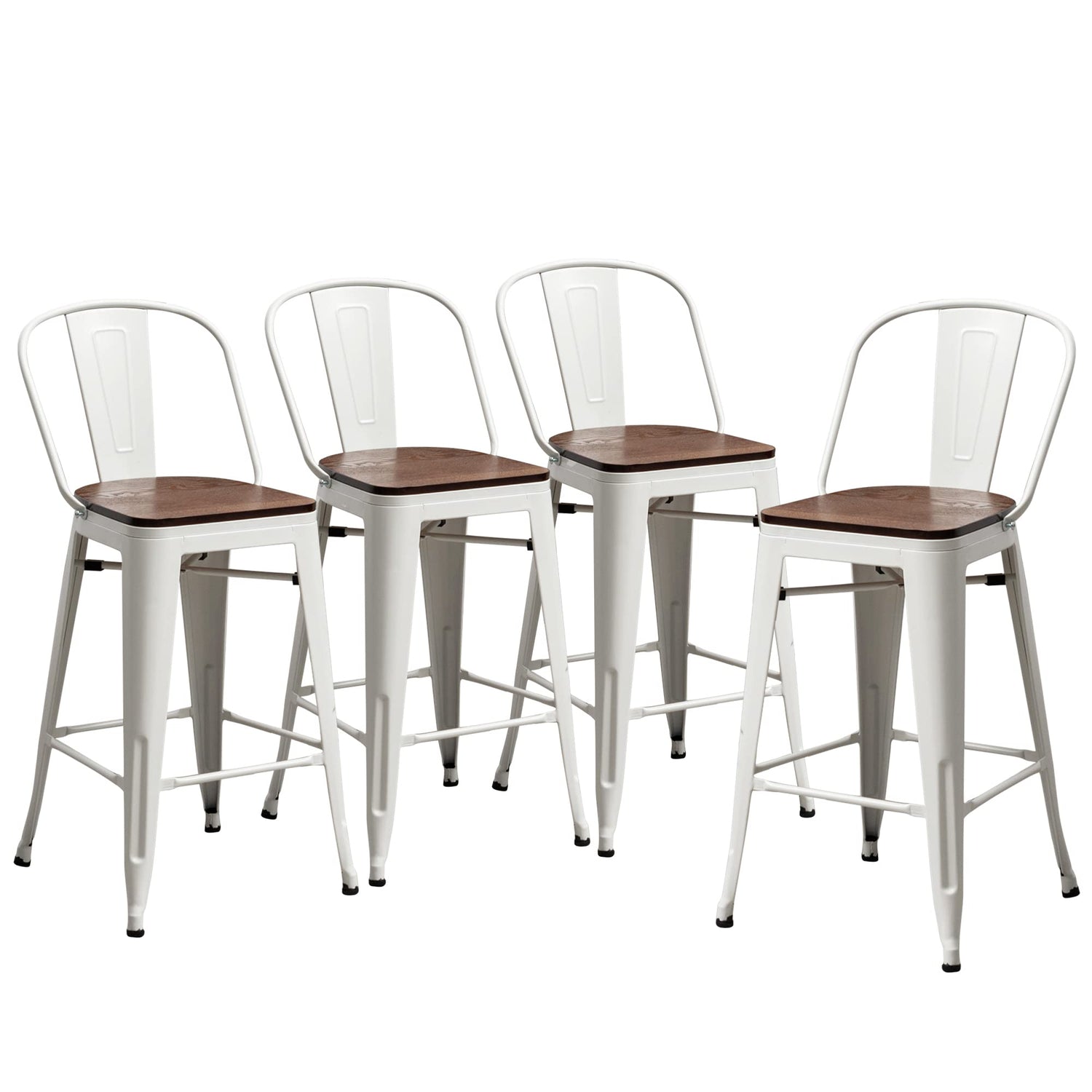 Yongqiang Metal Bar Stools Set of 4 Kitchen Island Counter Height Bar Stools High Back Farmhouse Barstools with Large Wooden Seat 24 inch Cream White