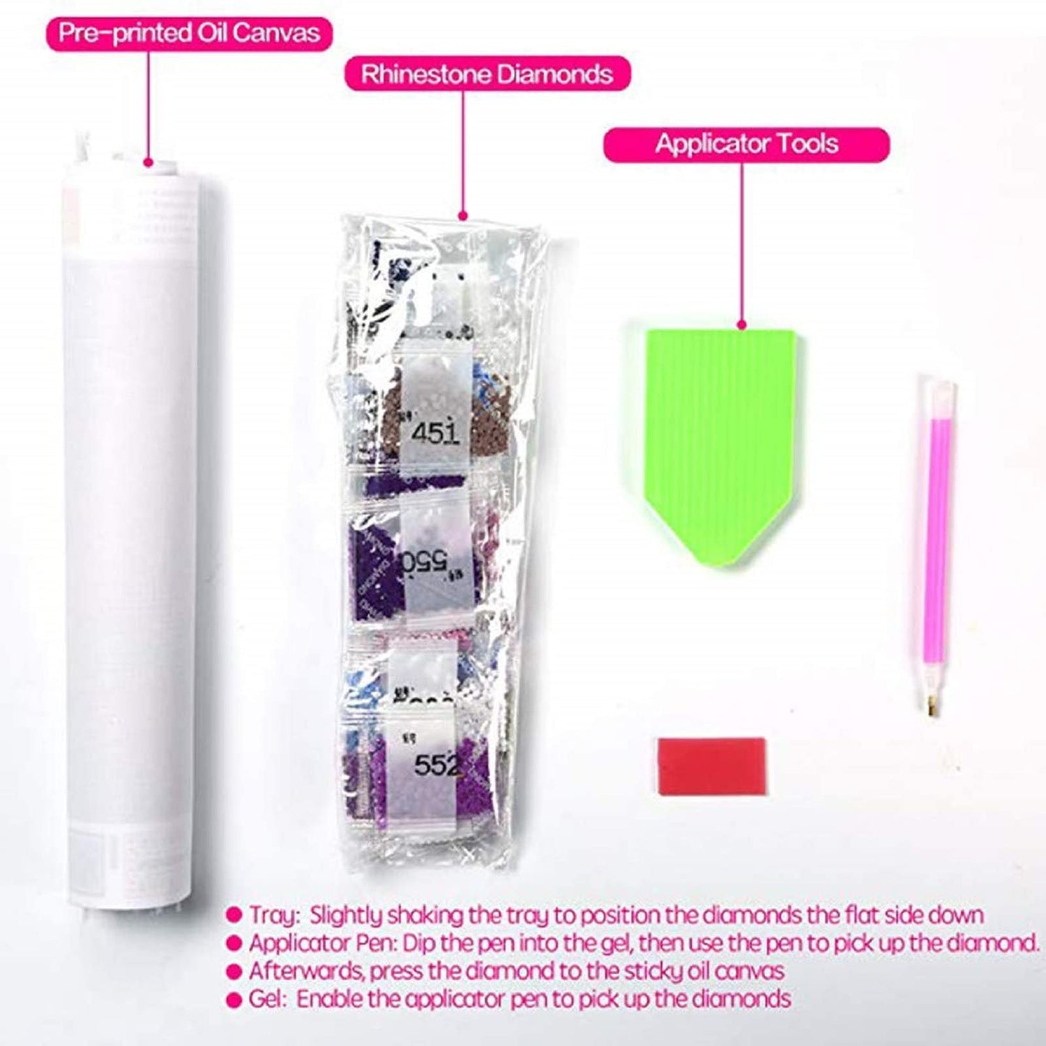 • 100% full-round drill 5d diamond painting kit: This kit includes everything you need to complete your diamond painting project, including diamonds, canvas, adhesive,diamond applicator pen and plastic tray.