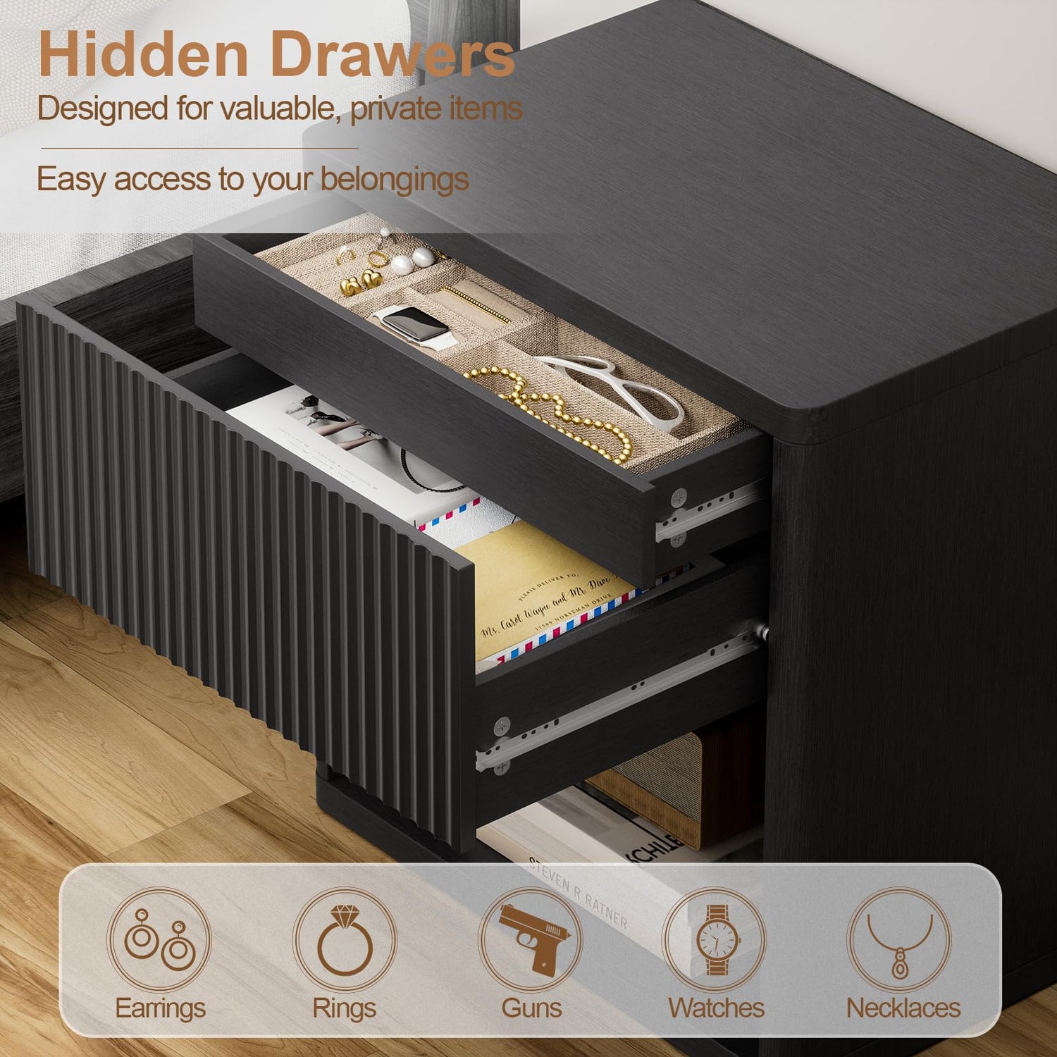 - 【MODERN DESIGN】: Expertly crafted with a distinctive fluted wave design, this black night stand set of 2 seamlessly blends modern and mid-century styles. The rounded corners not only enhance its visual appeal, adding a soft, elegant touch, but also prioritize safety, making it ideal for homes with children. Its versatile design easily complements any home decor, adding both style and functionality to your space.