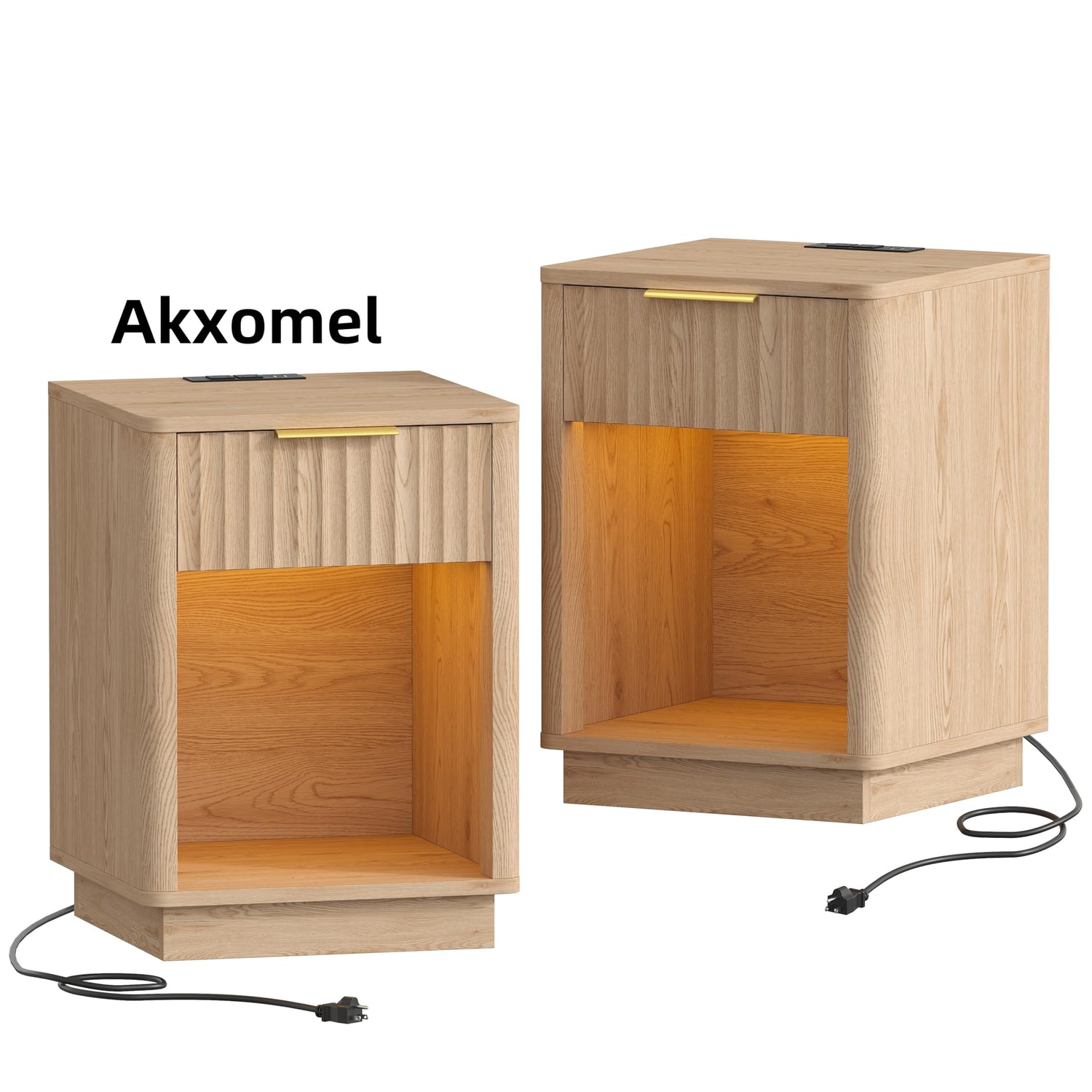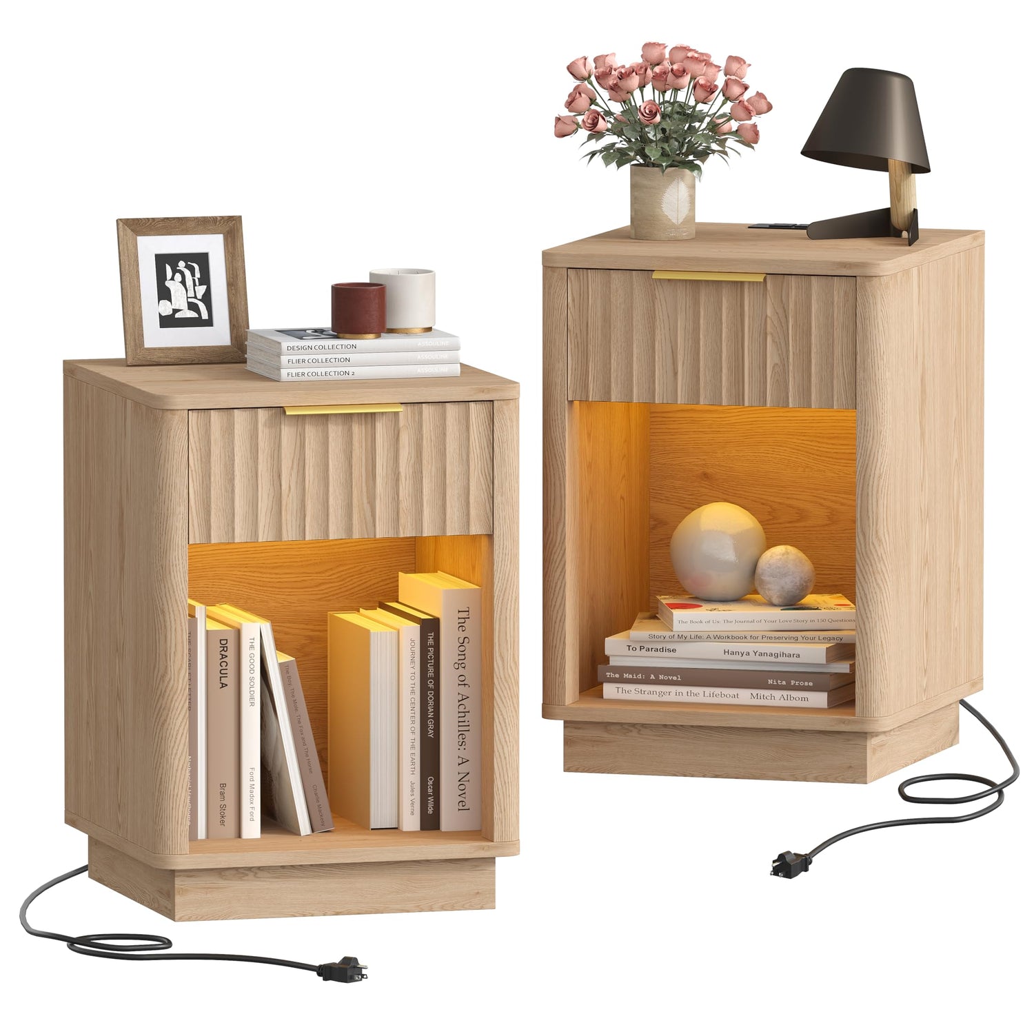 Akxomel Fluted Nightstands Set of 2, Wooden Night Stand with Charging Station and LED Light, Modern Mid Century End Table with Drawer, 15" D x 15.7" W x 22.6" H, for Bedroom, Natural Oak