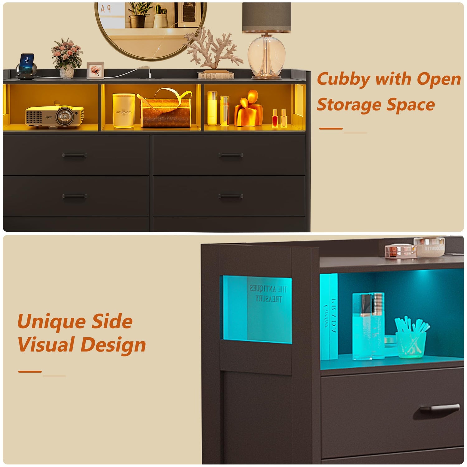 - 【Chest Of Drawers With Led Lights】This drawer dresser is equipped with multi-color RGB LED light, provide visual light effects on the front and sides.The colors, and brightness can be freely adjusted through the button and App, or customize style modes (Flashing,Jump,Fade,etc) in different speeds, add a unique vibe to your home. And there are many other modes waiting for you to explore: music mode, mic mode and timer setting function.