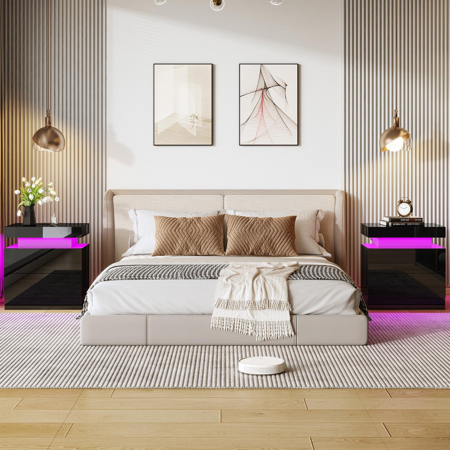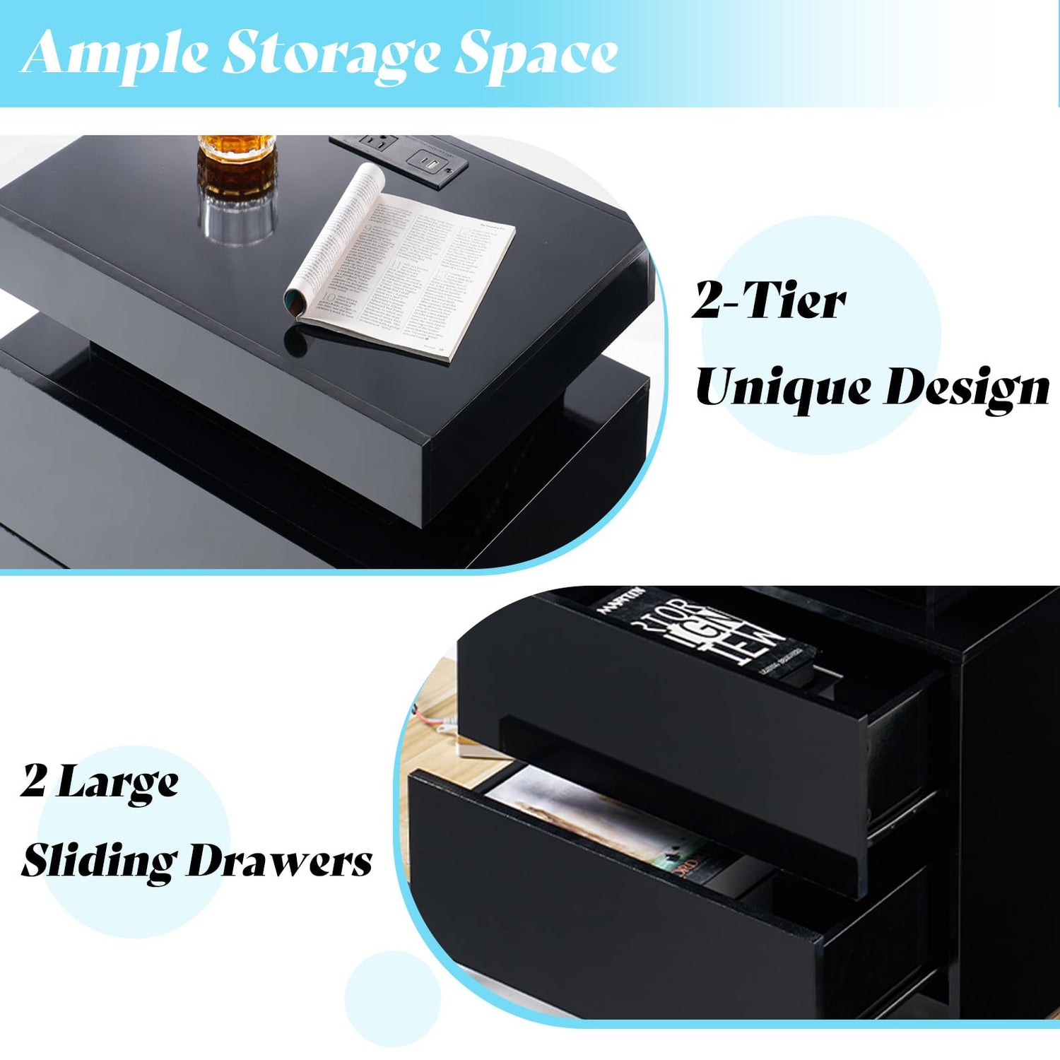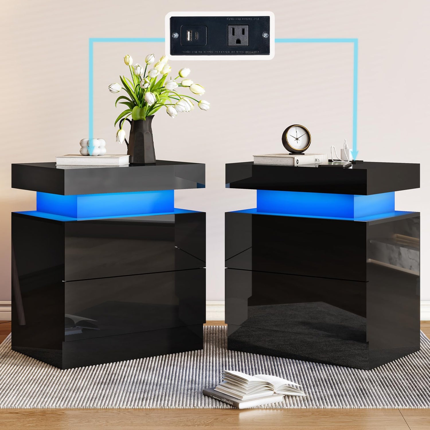 AMERLIFE High Gloss LED Nightstand Set of 2 with Charging Station, Modern Bedside Table Night Stand with LED Lights, Sofa End Side Tables with Drawers for Bedroom Living Room, Black