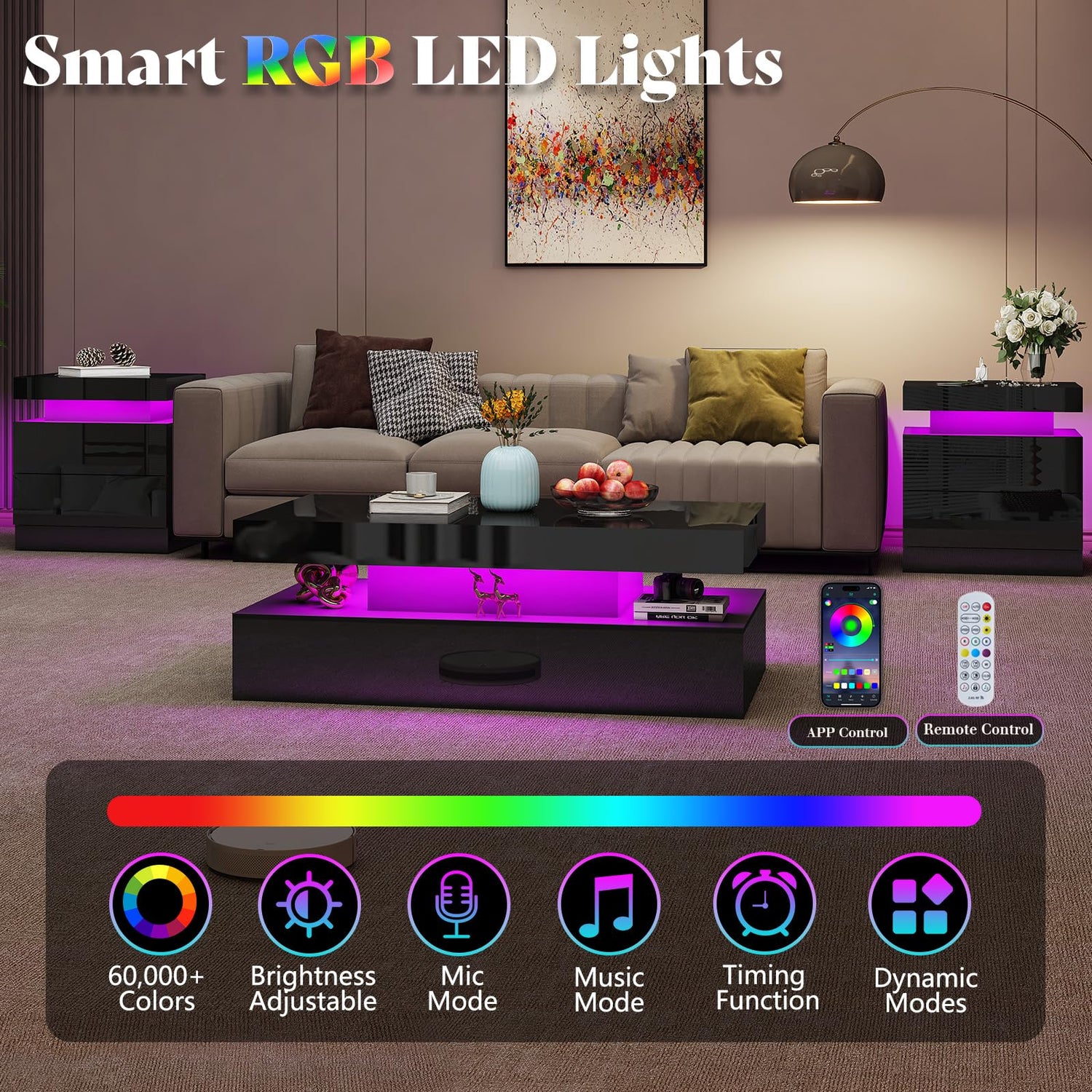 - LED Lights Night Stand: Modern end tables equipped with over 60,000 colors and multi-dynamic modes(static, flashing, jump, and fade) to choose from, adjusted by remote control and APP. Create any home atmosphere you want
