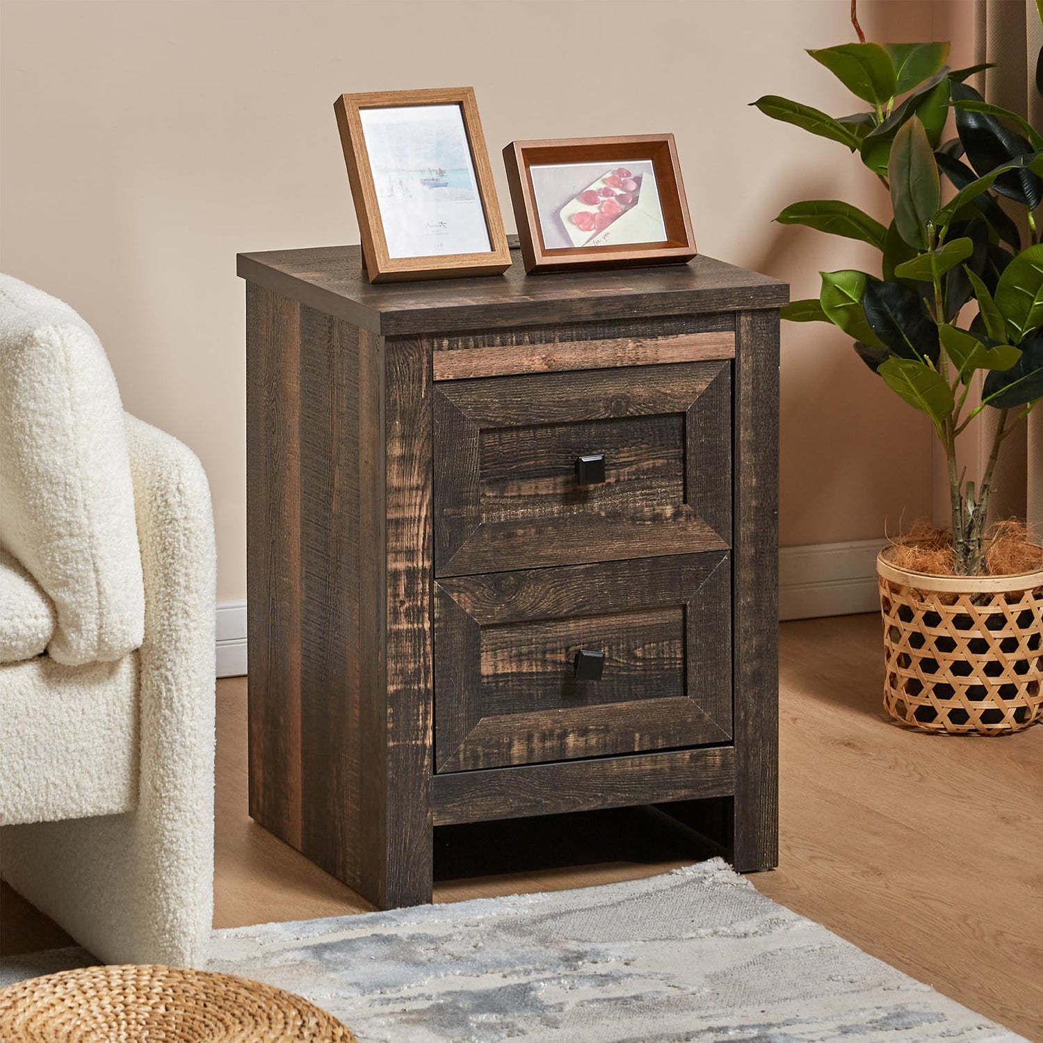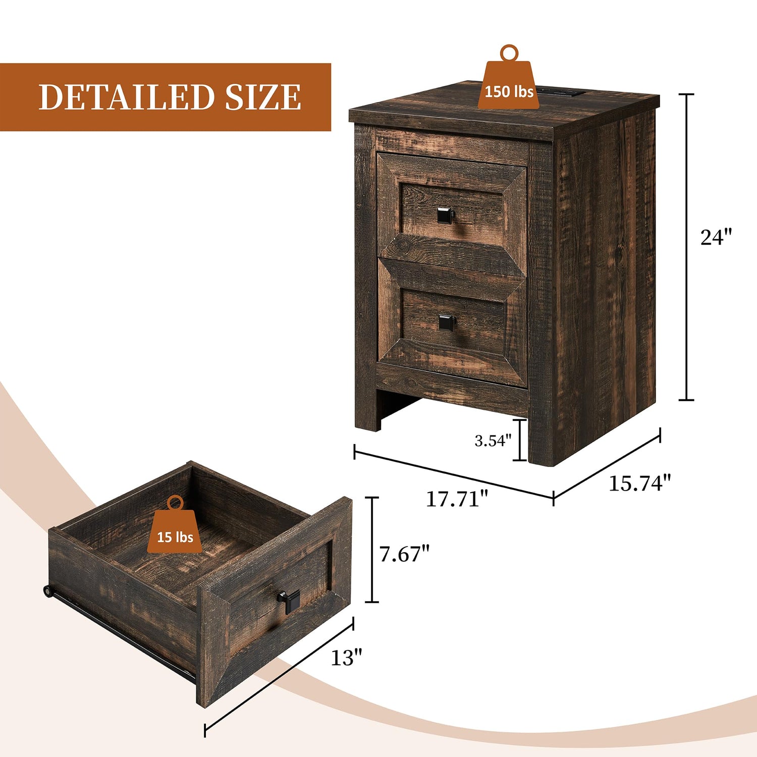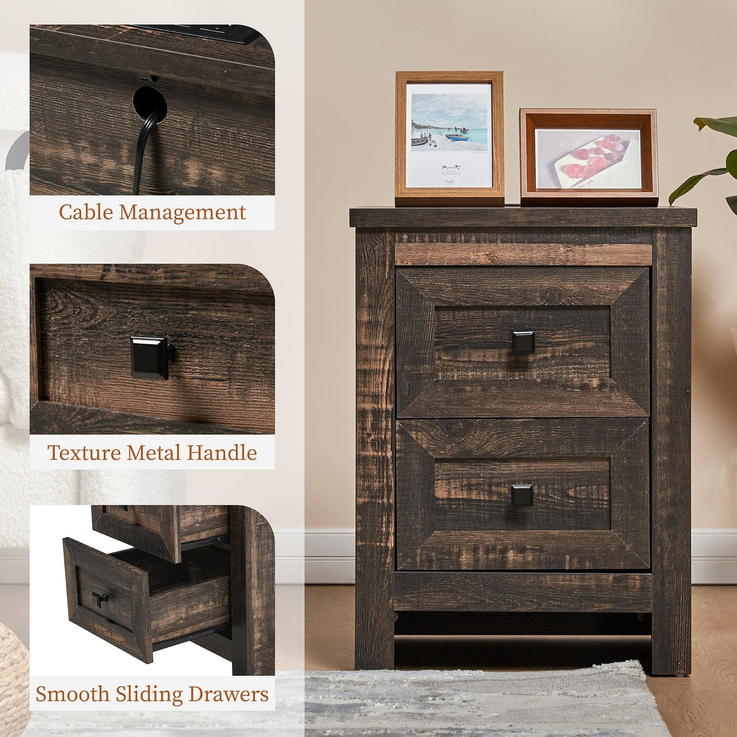 AMERLIFE Nightstand Set of 2 with Charging Station, Rustic Bedside Table with Drawers Storage, Farmhouse Wood Night Stand for Bedroom, Living Room, Dark Oak