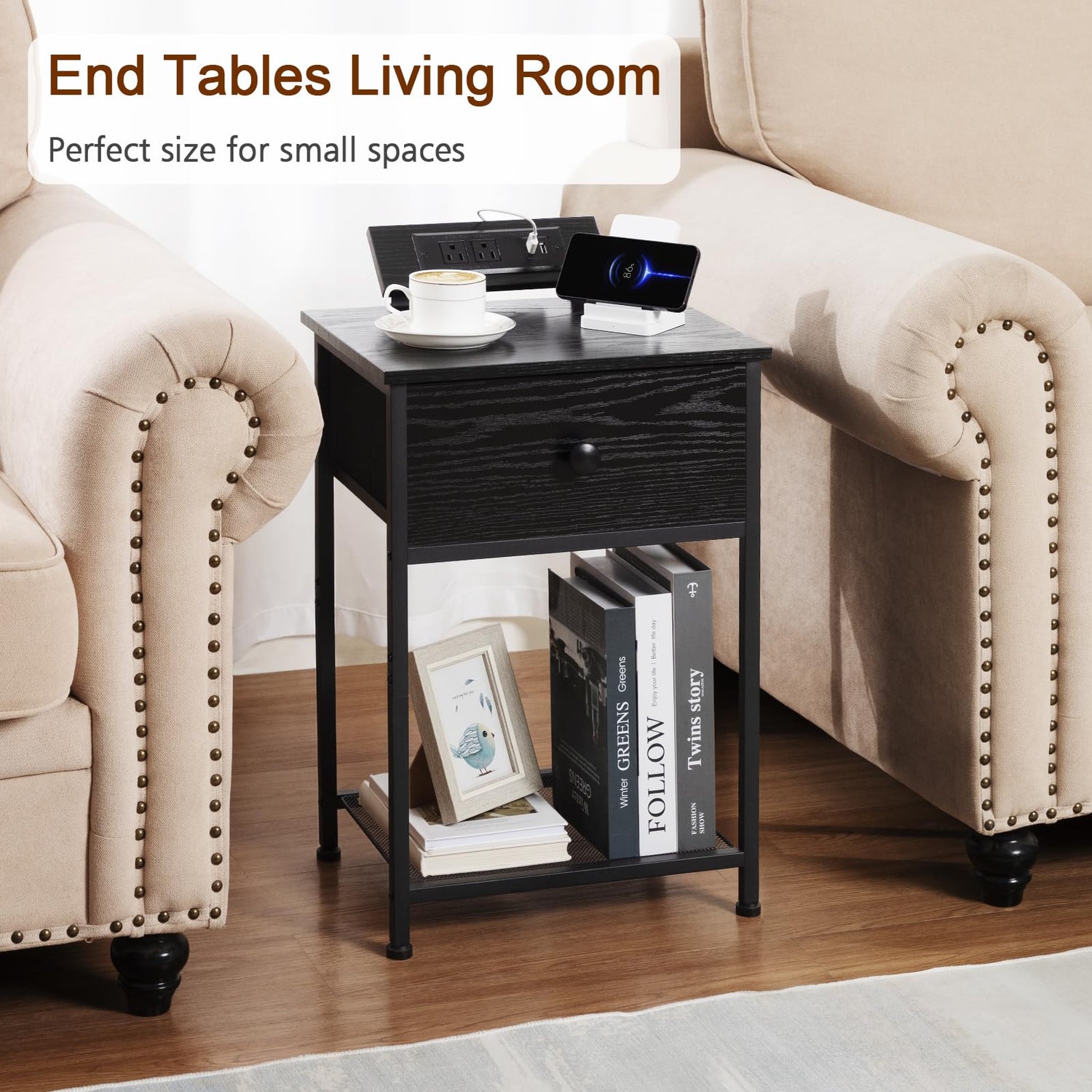 AMHANCIBLE Night Stand, Black Nightstand Set of 2, Small End Tables Living Room with Charging Station, Slim Bed Side Table with Fabric Storage Drawer for Bedroom, Small Space, HET03SDPBK