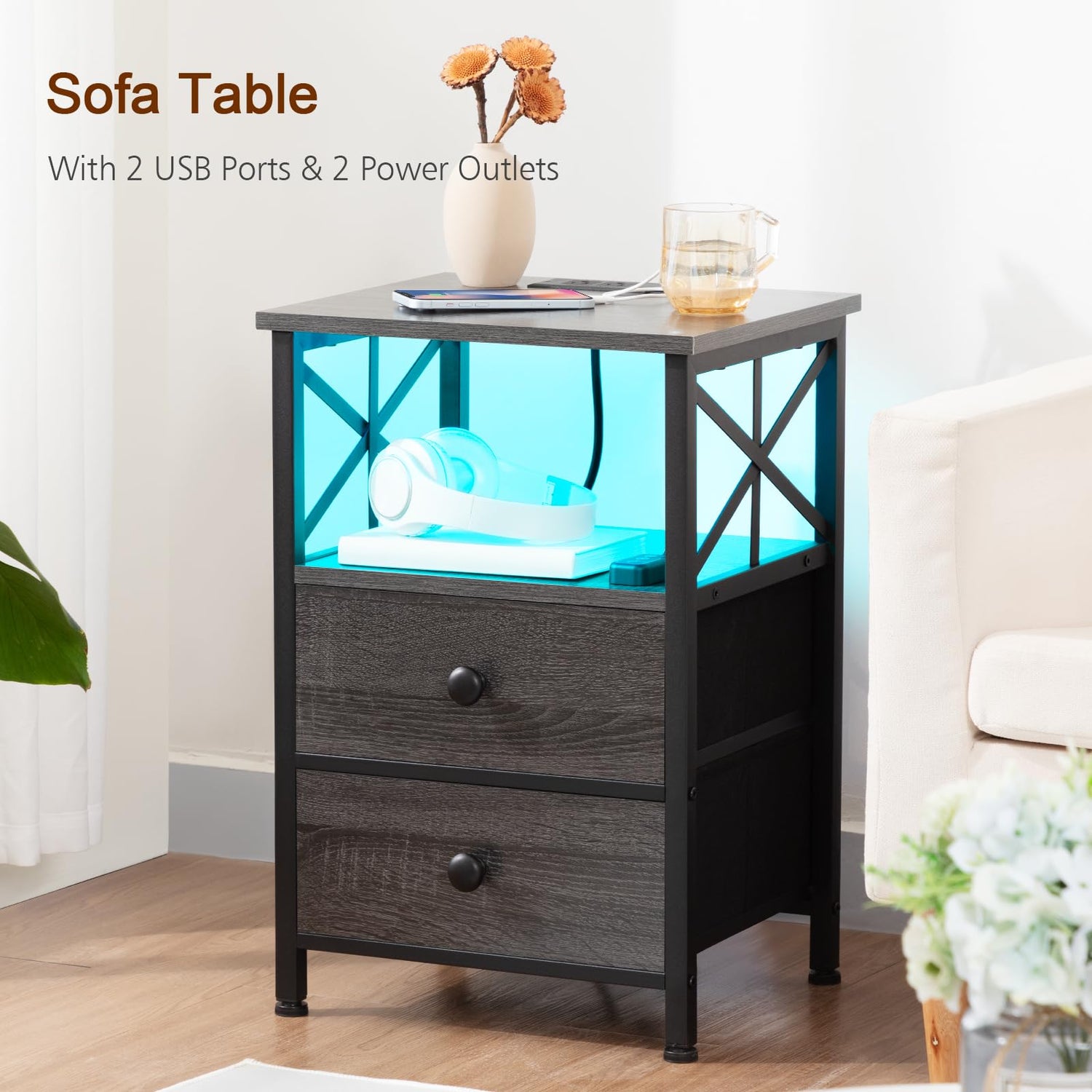 AMHANCIBLE Night Stand Set 2, LED Nightstands for Bedroom Set of 2 with Charging Station, End Table with USB Port and Outlet, Side Table with 2 Storage Drawers for Living Room, Dark Grey HET052LDG