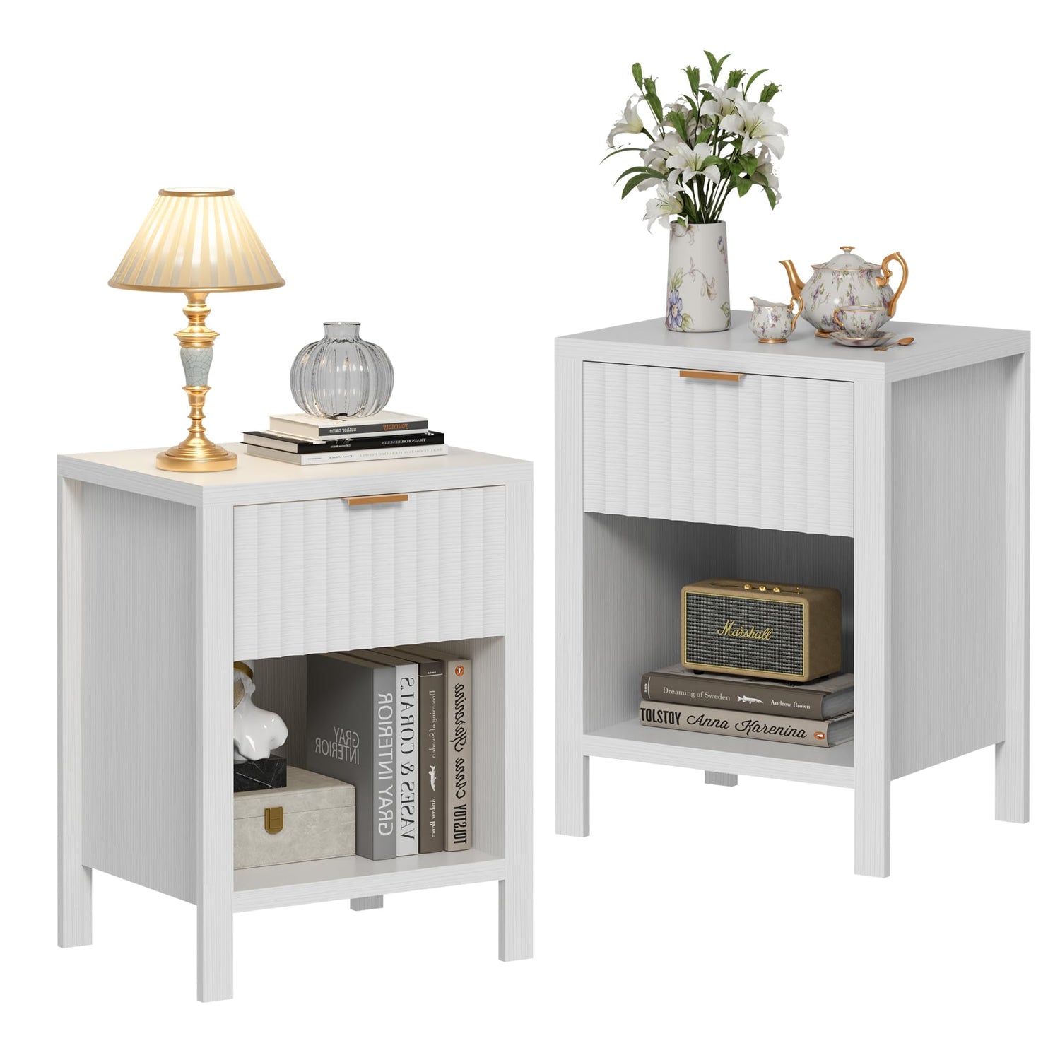 Anbuy White Nightstands Set of 2,Fluted Nightstands with Metal Handle,Wooden End Side Table White Bedside Table for Bedroom,Living Room